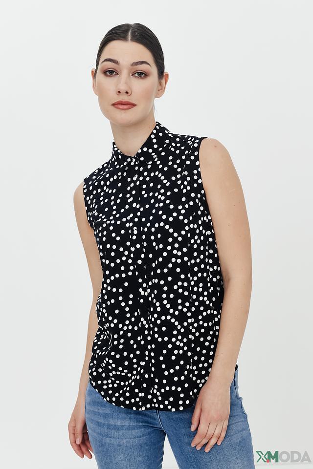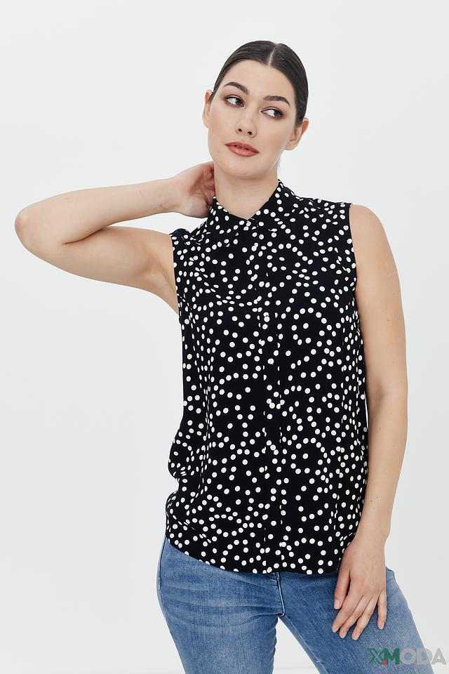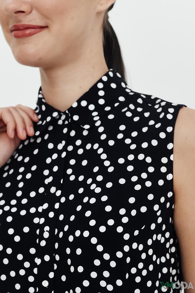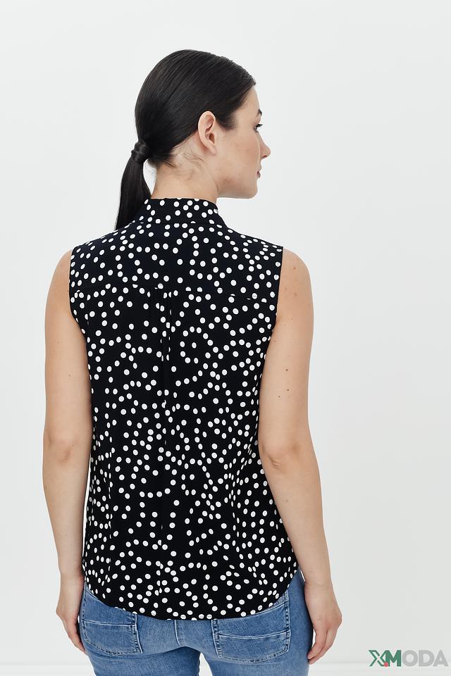 Чёрная блуза Pezzo с белым горошком – стильный и универсальный выбор для создания модных образов. Модель без рукавов с воротником-стойкой и завязками добавит изысканности вашему гардеробу. Состав: вискоза 100%