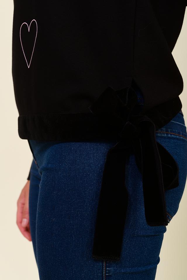 Пуловер имеет свободный крой, который обеспечивает комфорт в носке. Декорирован белыми сердечками, создающими игривый и романтичный образ. Боковые завязки позволяют регулировать посадку по фигуре, подчеркивая талию.