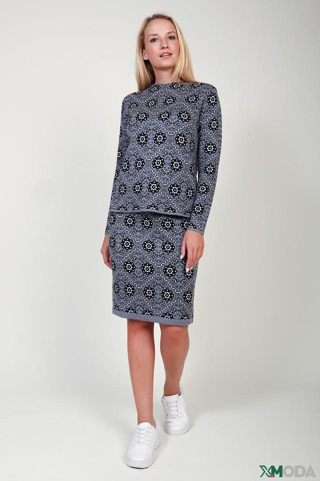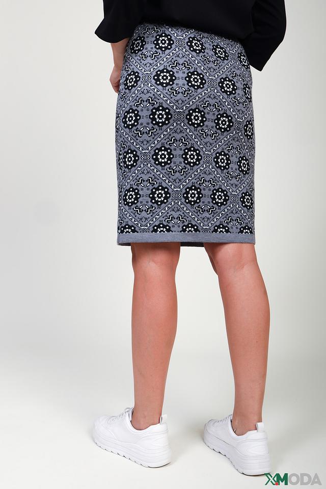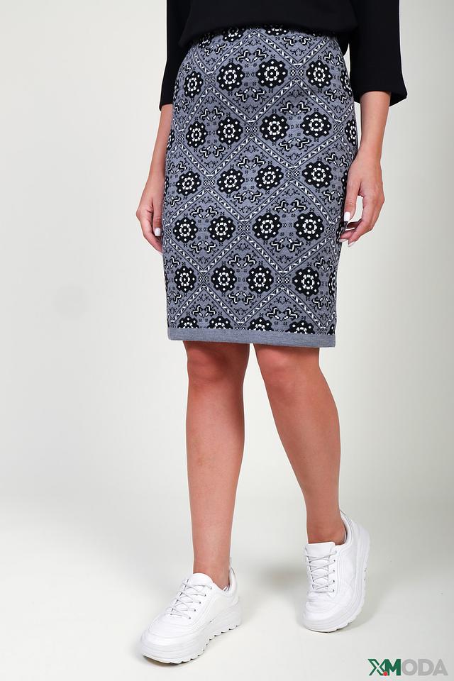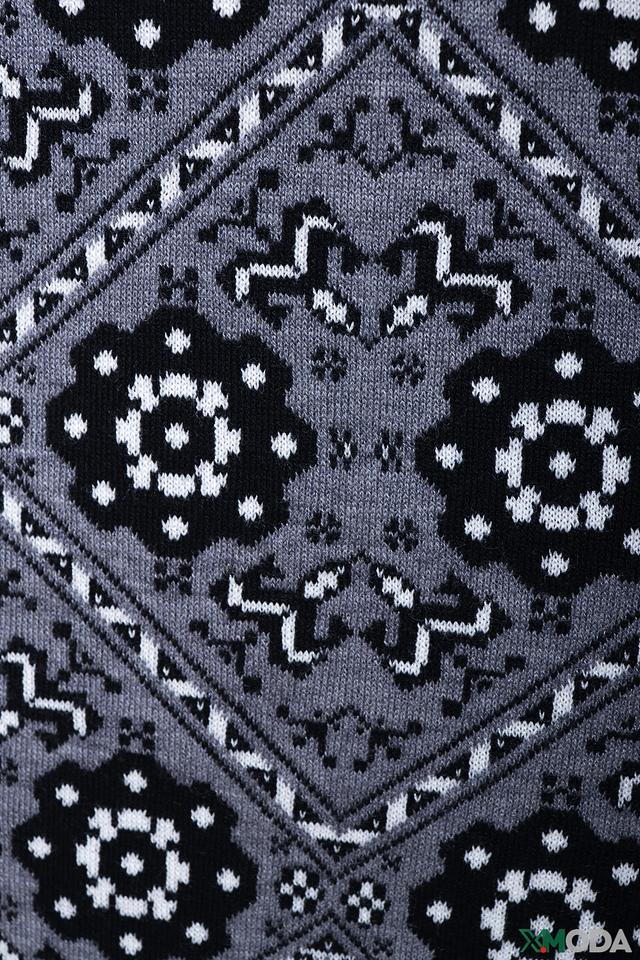 Основной цвет юбки – серый, но благодаря сложному жаккардовому узору, она выглядит очень интересно и необычно. Узор выполнен в сочетании серого, белого и чёрного цветов, создавая эффектный визуальный контраст.