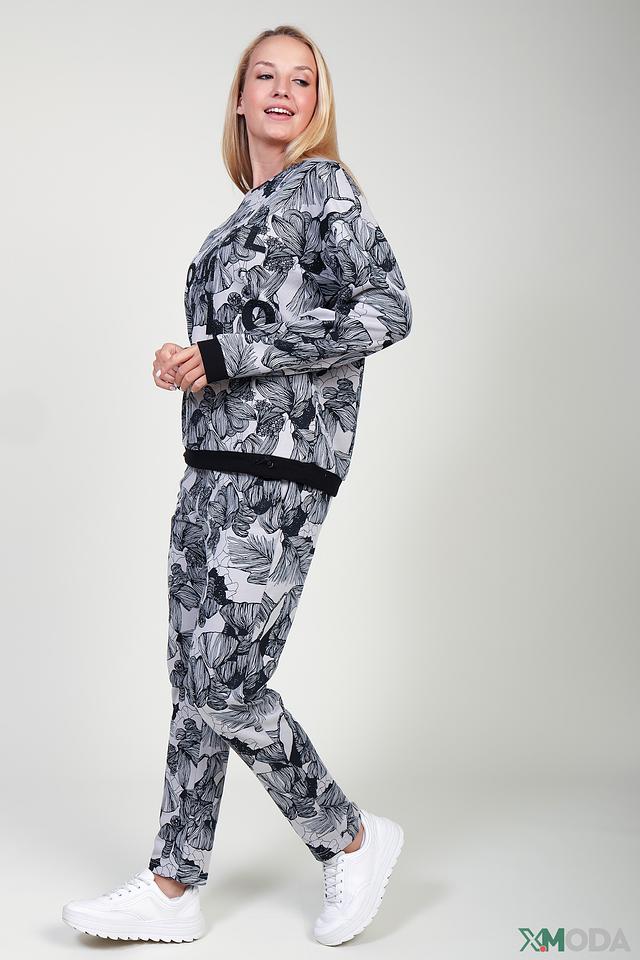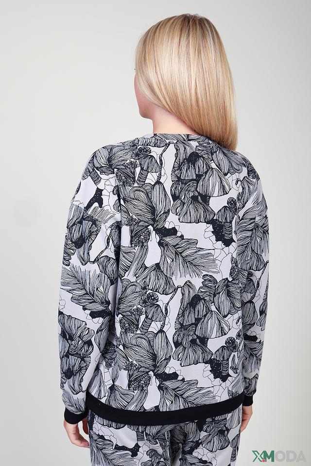 Пуловер имеет свободный крой, который не сковывает движения. Его украшает стильный цветочный принт в чёрно-белой гамме, а также надпись "BLOOM" на лицевой стороне. Эластичные манжеты и нижний край обеспечивают плотную посадку по фигуре.