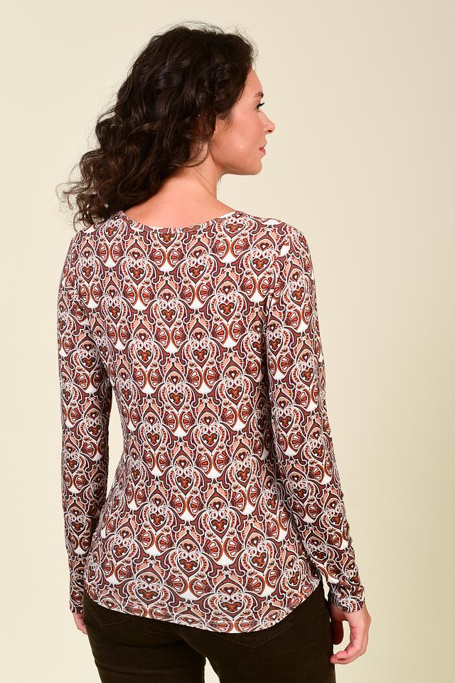 Особенностью модели является яркий и оригинальный геометрический принт в бежево-коричневой гамме, который придаёт изделию неповторимый вид. Пуловер имеет классический круглый вырез горловины и длинные рукава.