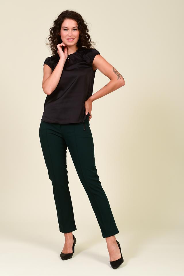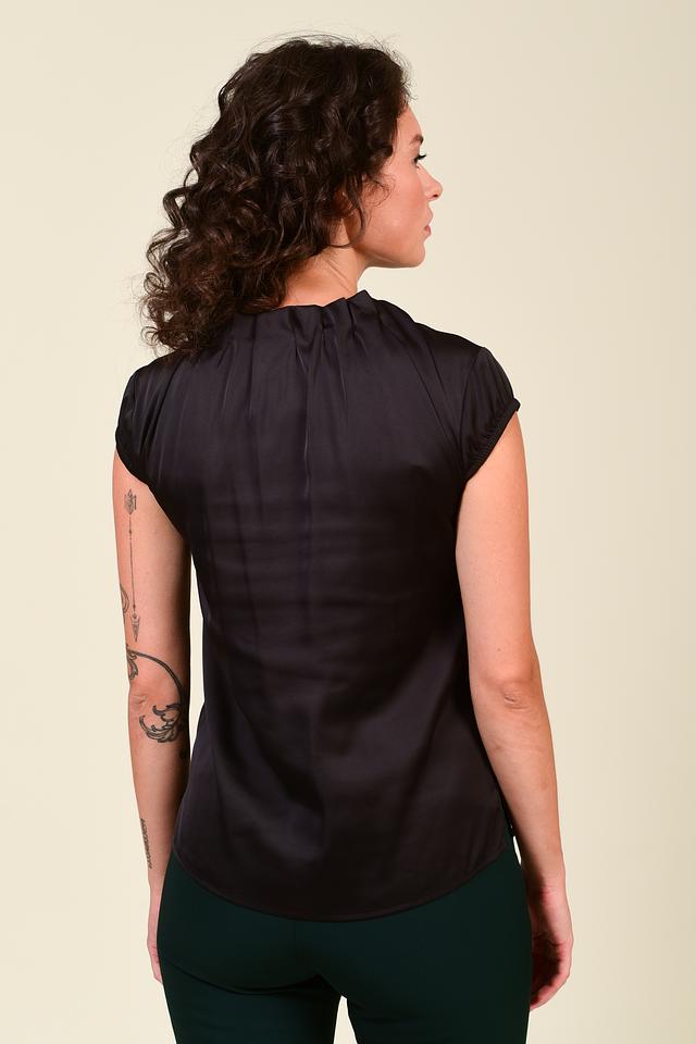 Черная блуза Pezzo из шелковистого полиэстера с короткими рукавами и изящной жемчужной застежкой. Модель имеет сборку по горловине и рукавам, что придает ей женственный и элегантный вид. Состав: полиэстер 97%, эластан 3%