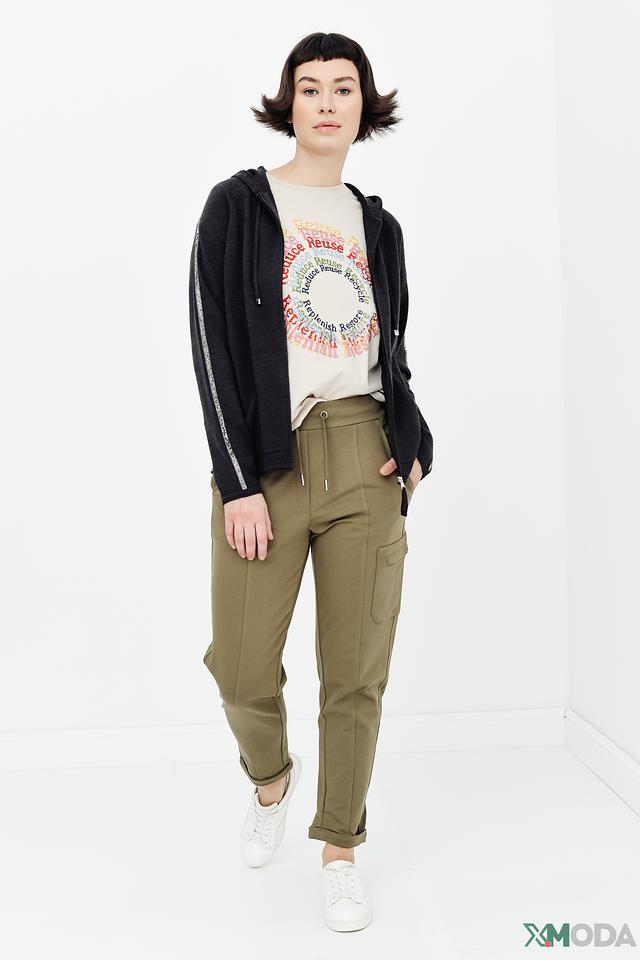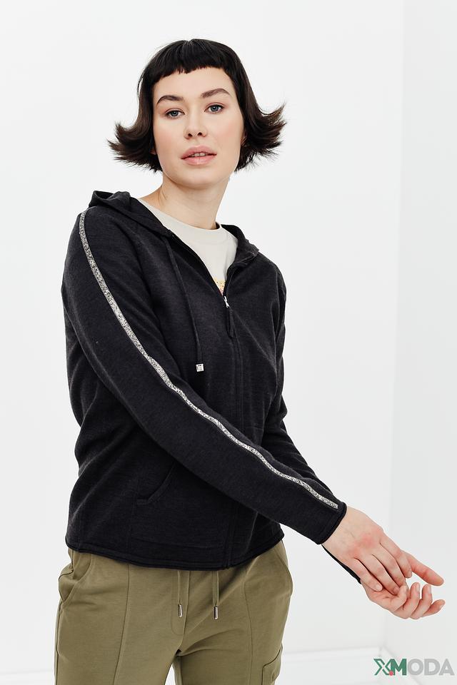 Толстовка имеет удобную молнию, капюшон и карманы. Декоративная полоска с блестящими нитями на рукавах придает образу изысканность и оригинальность.