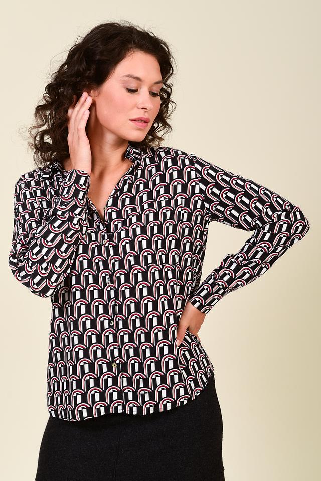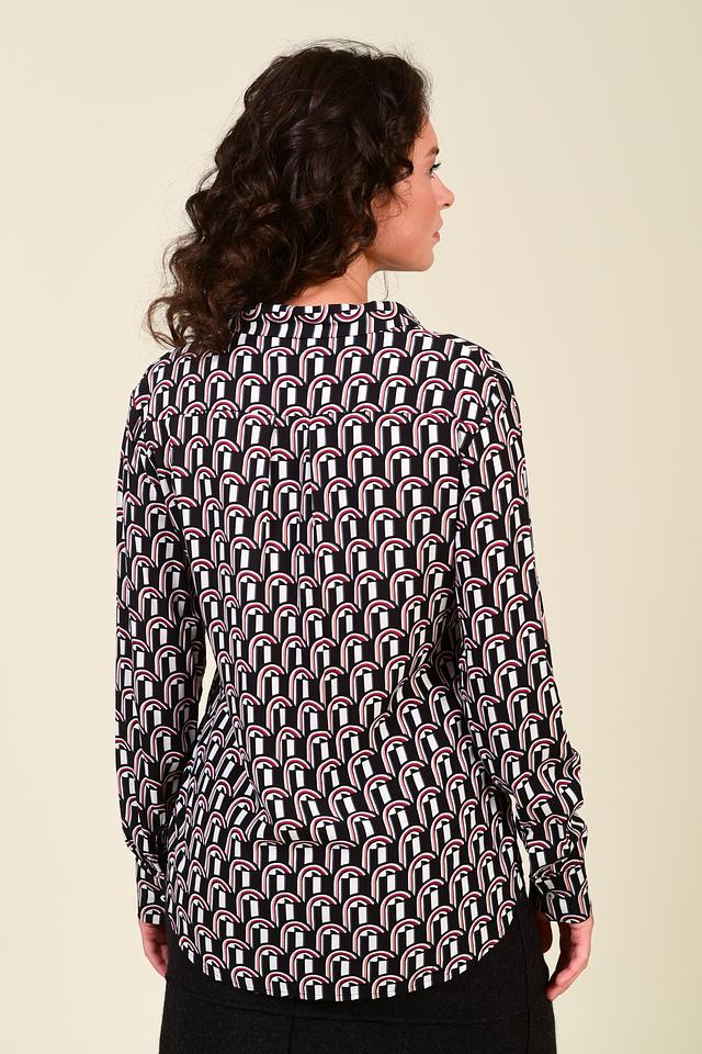 Основной цвет блузы – чёрный, но её украшает яркий геометрический принт, выполненный в белых и розовых тонах. Такой рисунок добавляет изделию оригинальности и привлекает внимание.