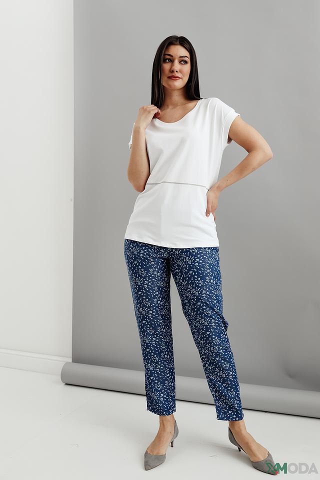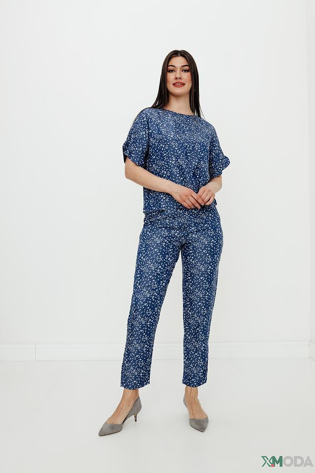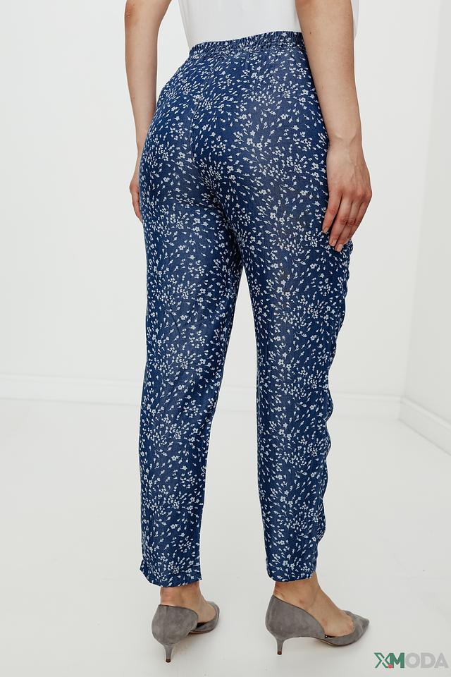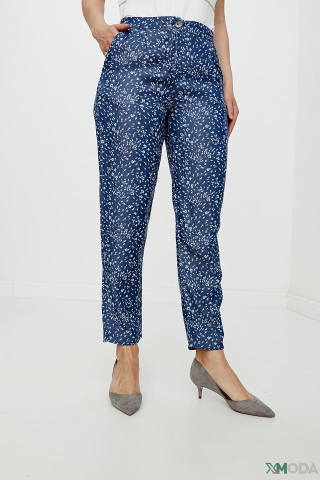 Брюки имеют классический крой с завышенной талией и прямыми штанинами, что делает их универсальными и подходящими для различных типов фигуры. Декорированы мелким цветочным принтом синего цвета на светлом фоне, что придает им женственность и элегантность.