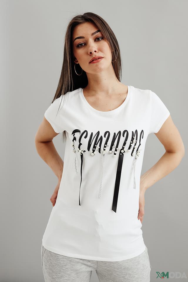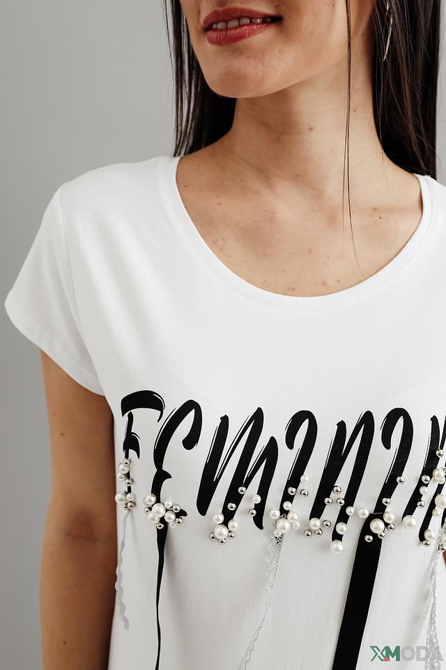 Основной цвет футболки – белый, а акцентным элементом является надпись "FEMININE", выполненная в чёрном цвете и украшенная мелкими бусинами. Такой дизайн придаёт футболке оригинальность и выразительность.