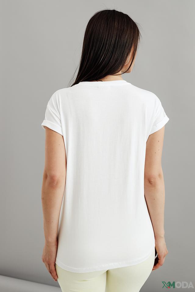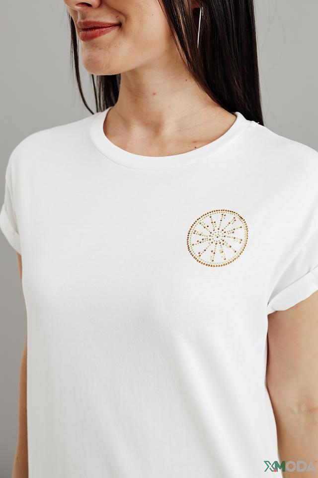 Особенностью данной модели является декоративная вышивка в золотистых тонах, которая придает ей изысканность и индивидуальность. Футболка имеет прямой крой и короткие рукава с манжетами, которые можно зафиксировать или оставить свободными.