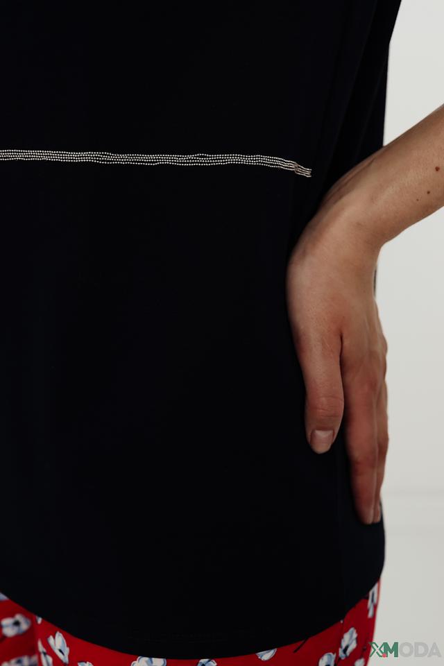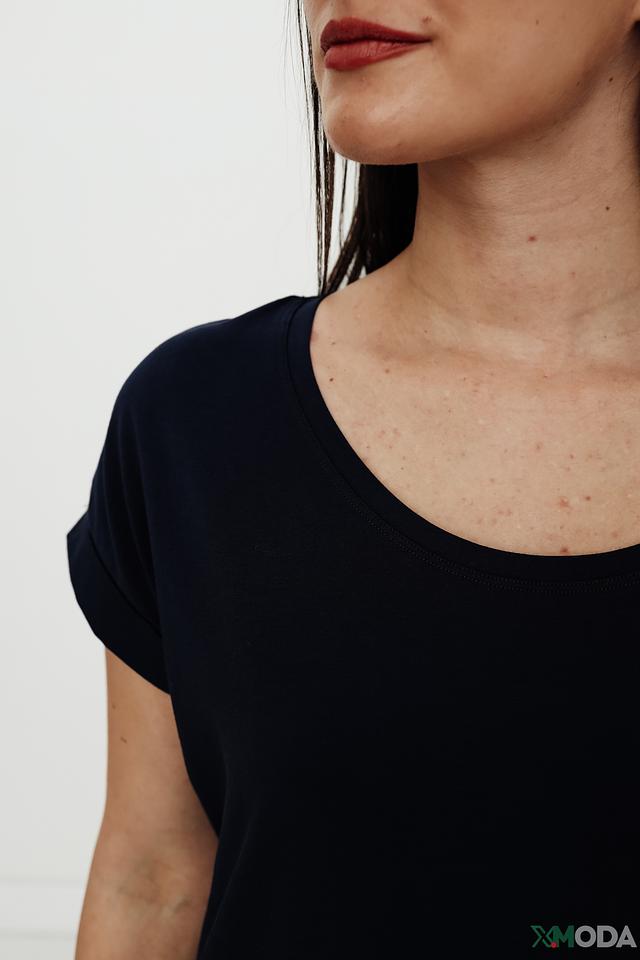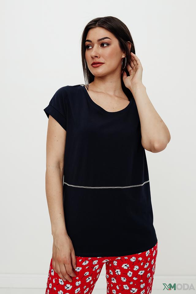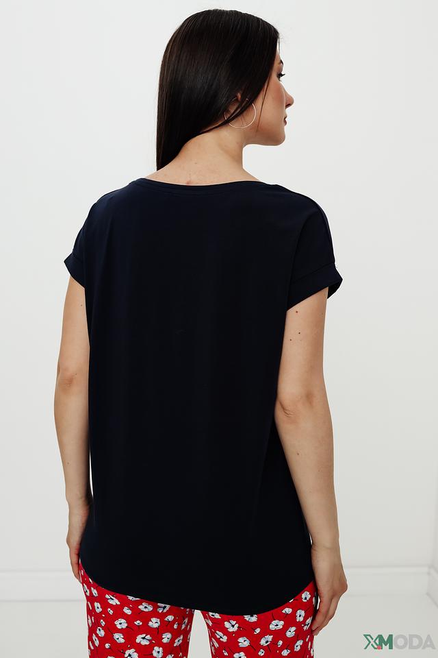 Футболка имеет классический прямой крой и круглый вырез горловины. Короткий рукав слегка закатан и фиксируется манжетой. На груди расположена декоративная полоска, которая добавляет модели изюминку.