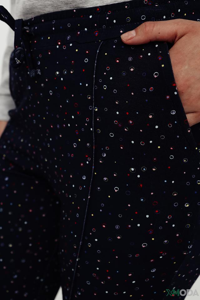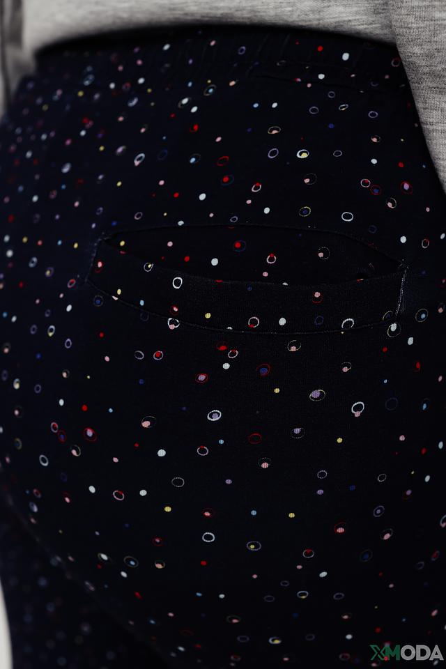 Брюки имеют классический крой с зауженными к низу штанинами и эластичным поясом с кулиской. По всей поверхности брюк расположен мелкий принт из красных и белых точек на темно-синем фоне, который придает им оригинальность и стиль.