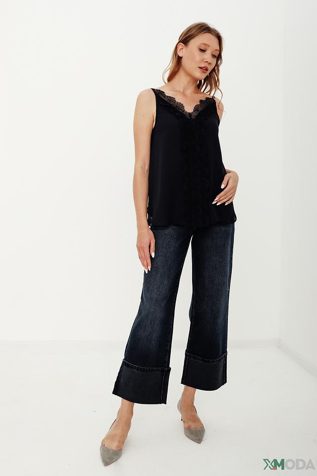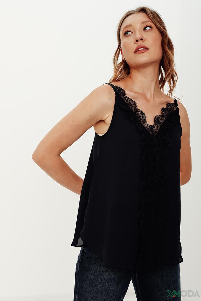 Особенностью данного топа является изысканный кружевной декор в области горловины и лифа, придающий ему женственность и элегантность. Тонкие бретели и свободный крой делают этот топ идеальным выбором для тёплой погоды.