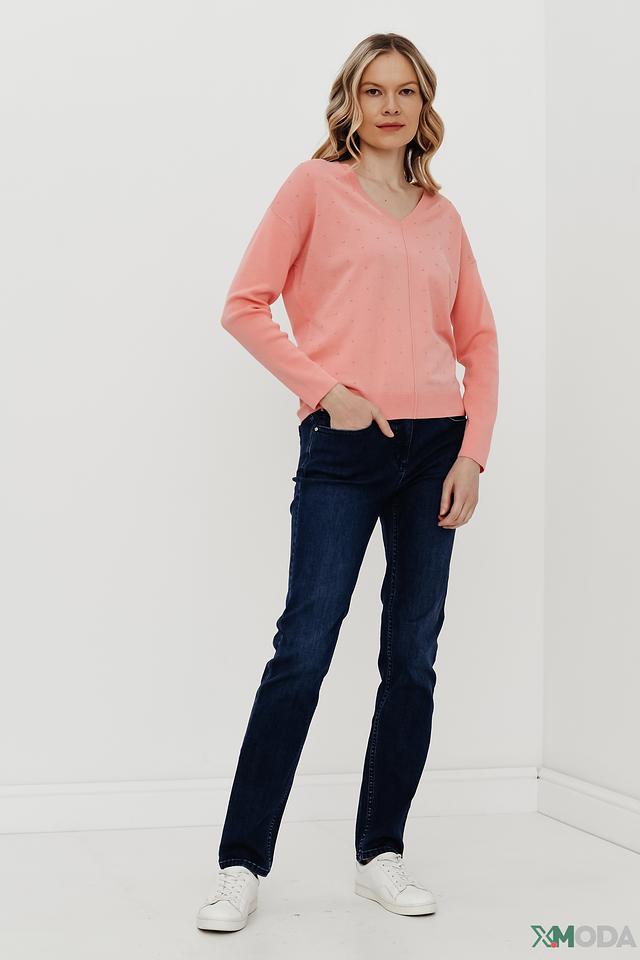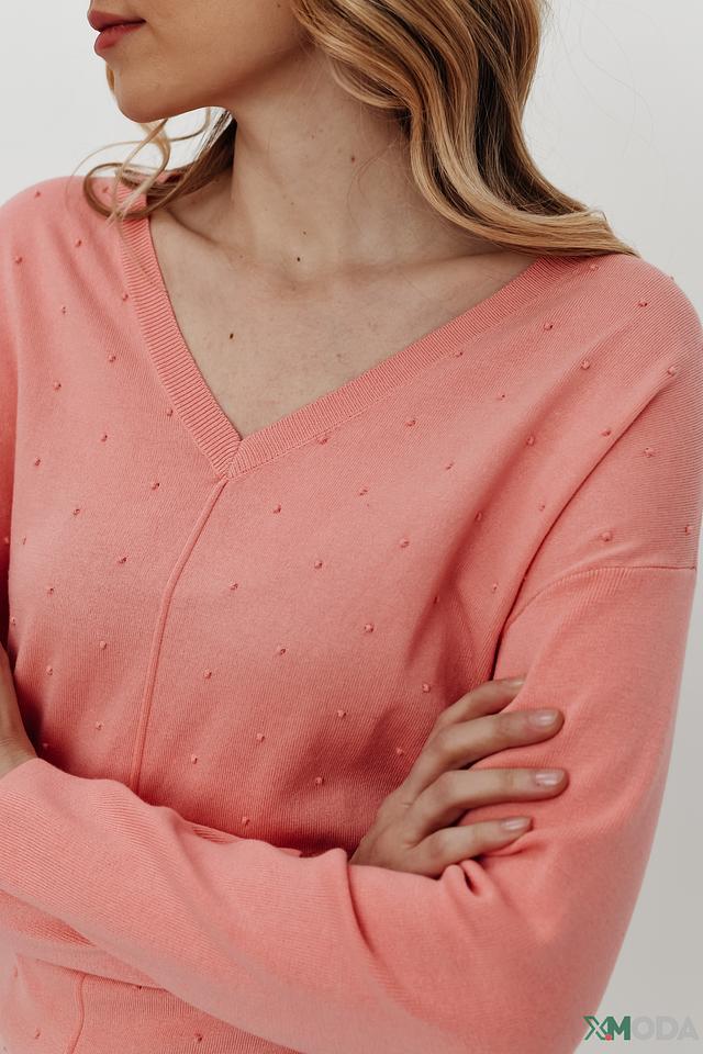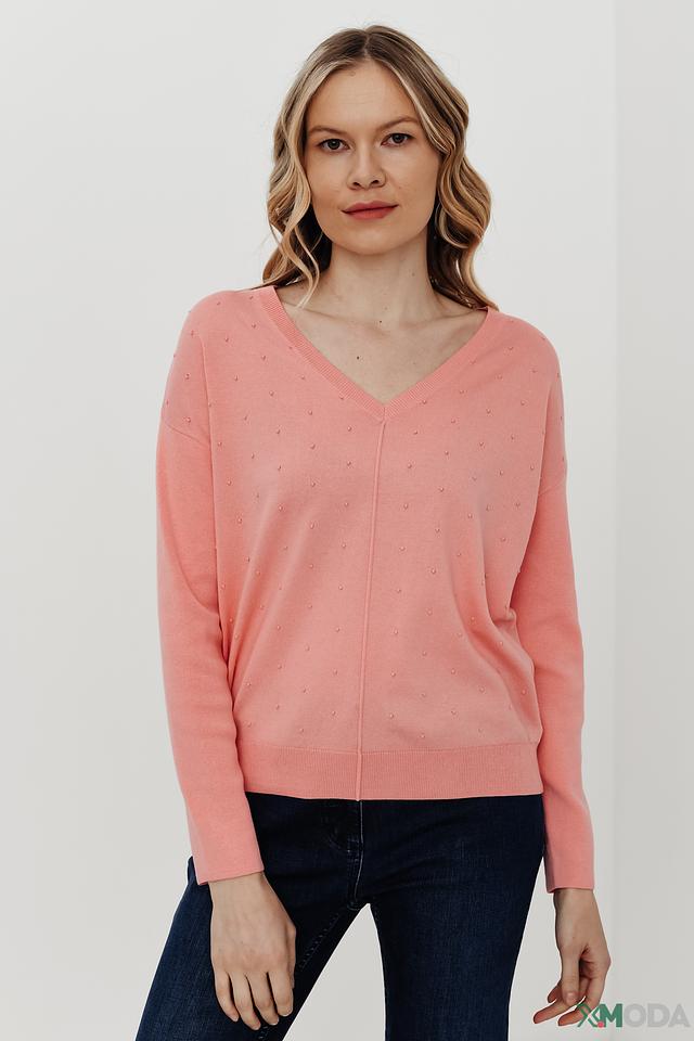 Особенностью данного пуловера является деликатное декорирование в виде небольших бусин, которые придают изделию изысканность и оригинальность. Пуловер идеально сочетается с джинсами, брюками или юбками, позволяя создавать разнообразные стильные комплекты.