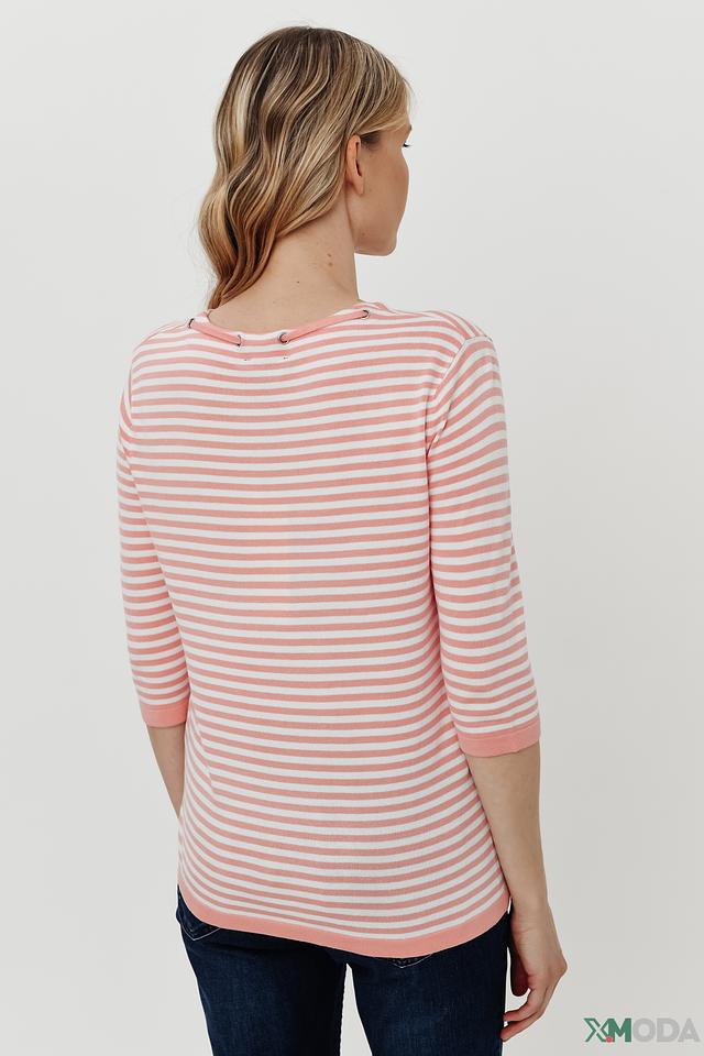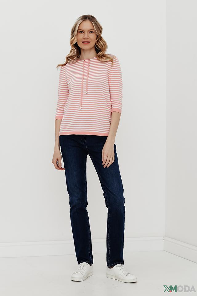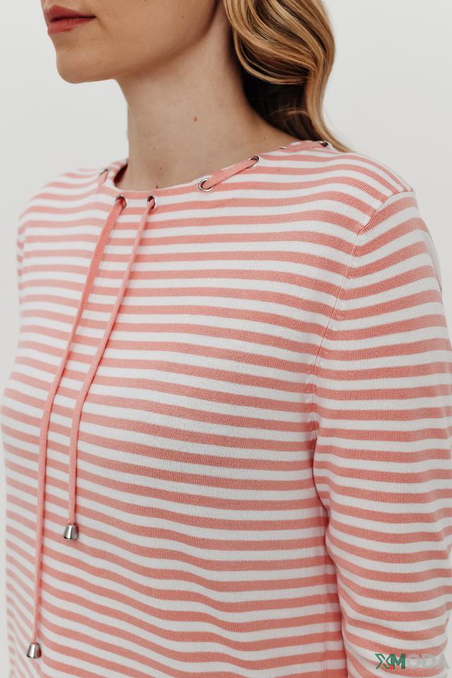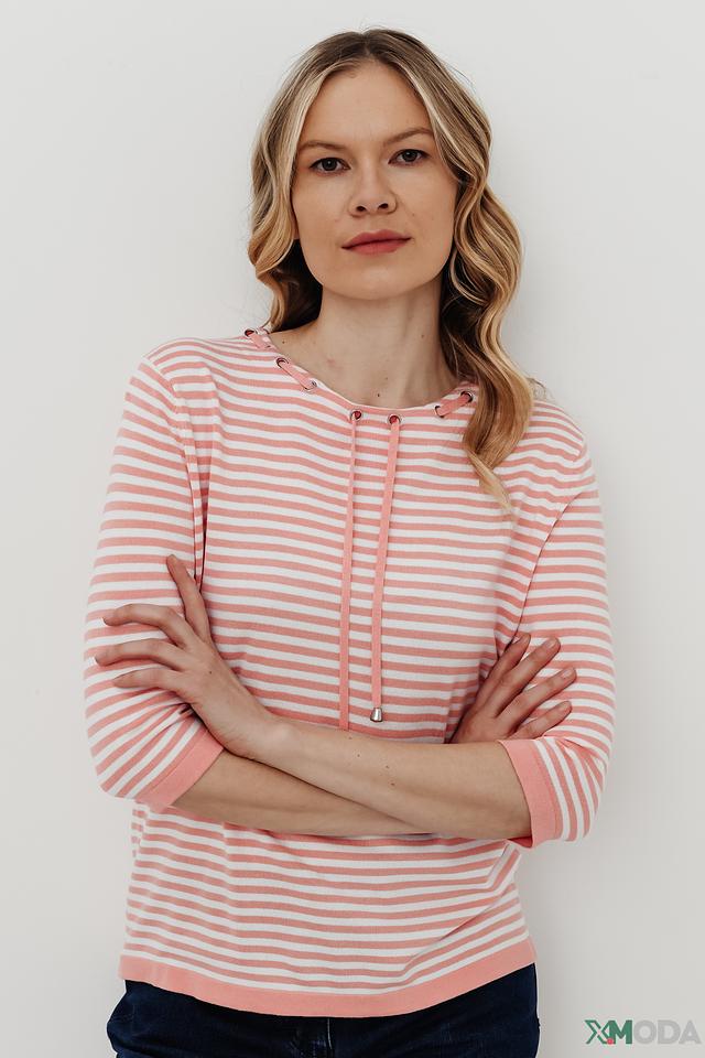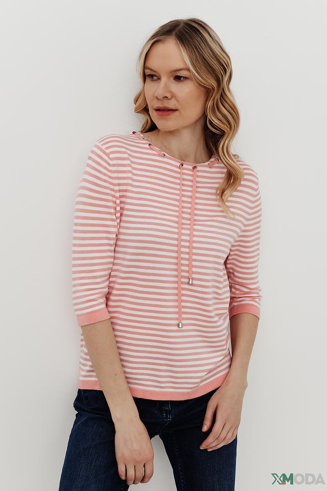 Женский пуловер Pezzo нежно-розового цвета в полоску с капюшоном на шнурке. Модель с рукавом 3/4 и округлым вырезом горловины, выполнена из мягкой вискозы с добавлением полиамида. Состав: вискоза 81%, полиамид 19%