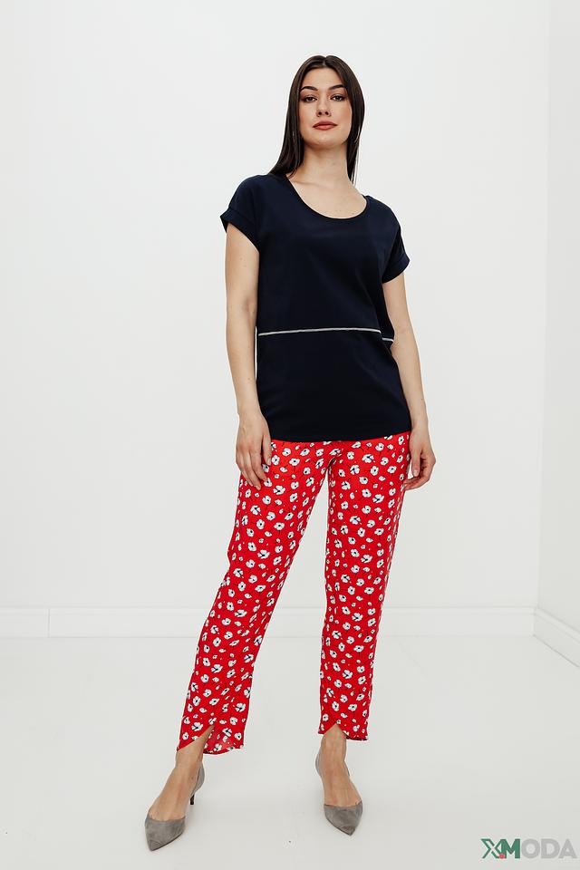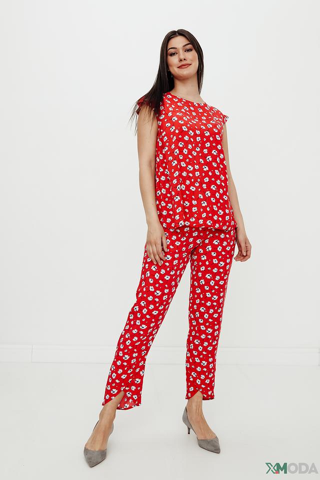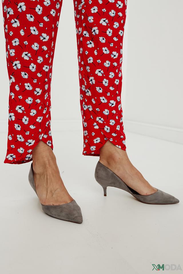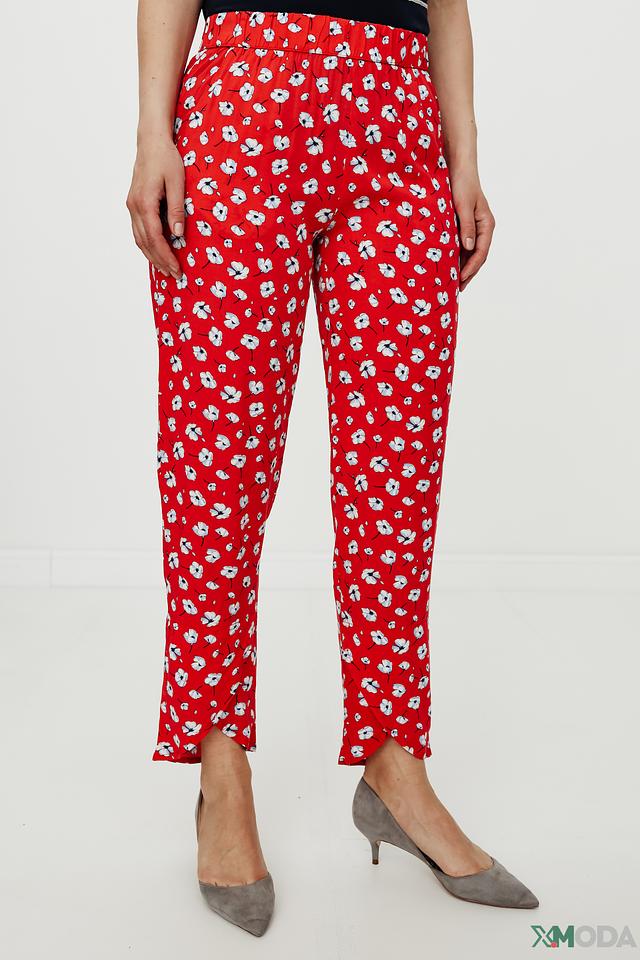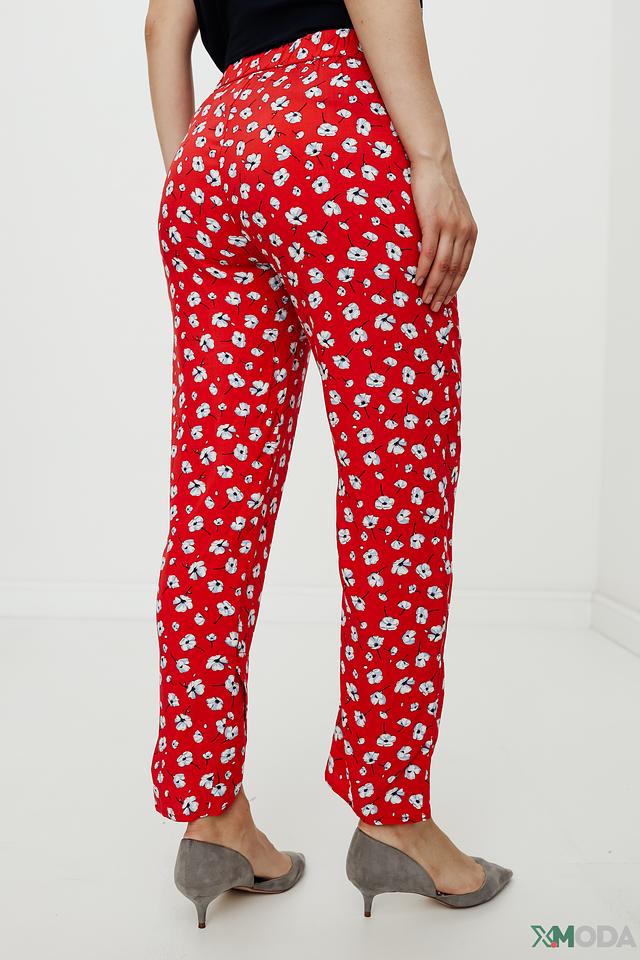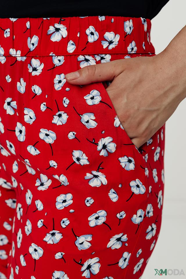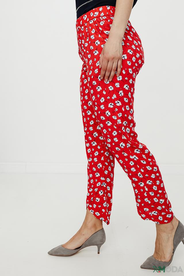 Брюки имеют яркий красный цвет, украшенный мелким цветочным принтом белого цвета. Это придает им свежий и женственный вид. Модель отличается завышенной талией и эластичным поясом, обеспечивающим удобную посадку.