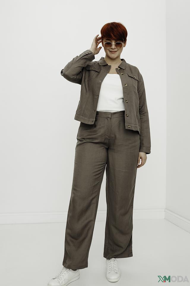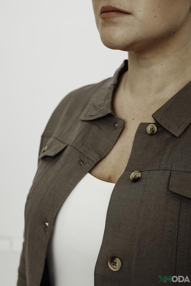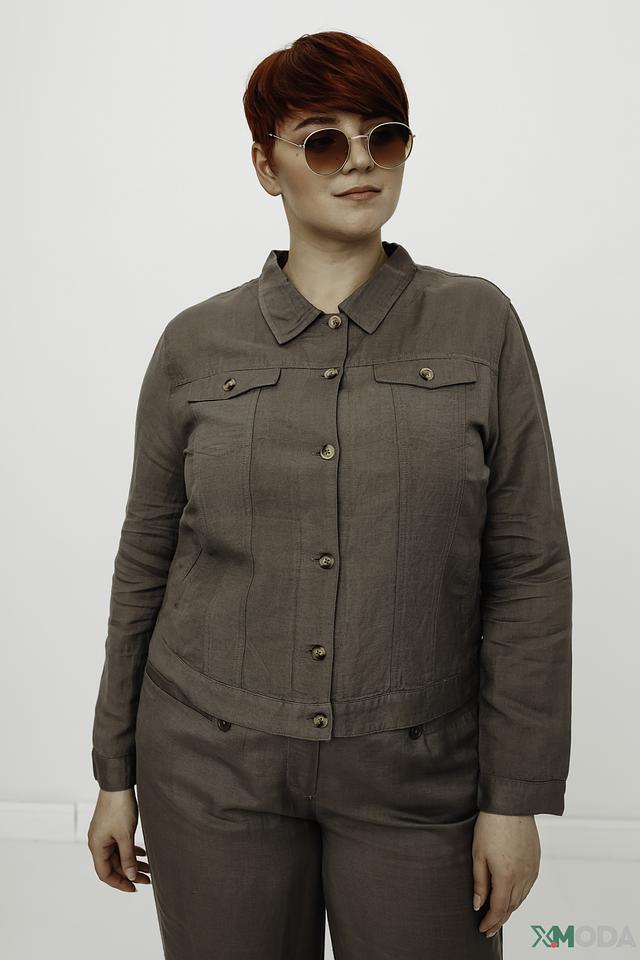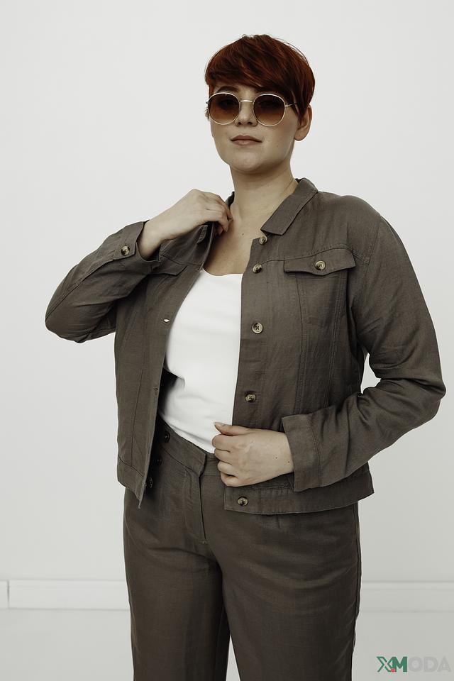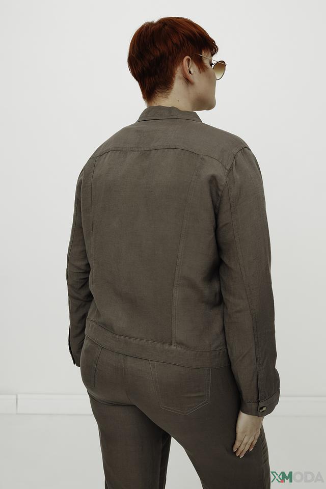 Жакет застегивается на пуговицы, имеет отложной воротник и длинные рукава. Изготовлен из сочетания льна и вискозы, что обеспечивает комфорт и воздухопроницаемость. Подкладка выполнена из 100% вискозы.