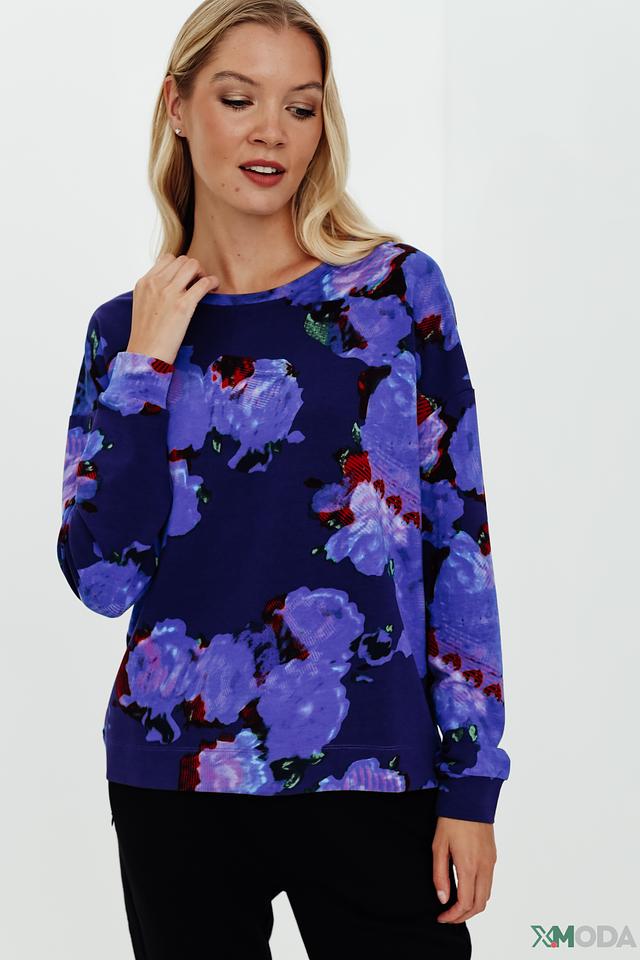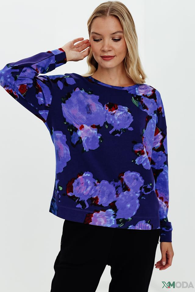 Женский пуловер Pezzo синего цвета с ярким цветочным принтом станет стильным дополнением к вашему гардеробу. Модель выполнена из мягкого и приятного к телу сочетания хлопка, модала и эластана, обеспечивая комфорт в носке. Состав: хлопок 47%, модал 45%, эластан 8%