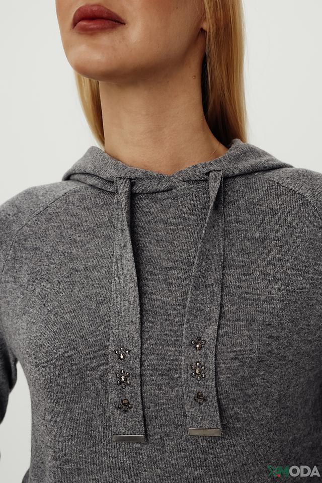 Передняя часть пуловера украшена декоративной отделкой в виде цепочек с подвесками, что придает ему изысканность и оригинальность. Капюшон дополнен шнурками для регулировки.