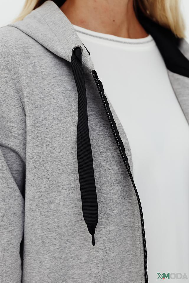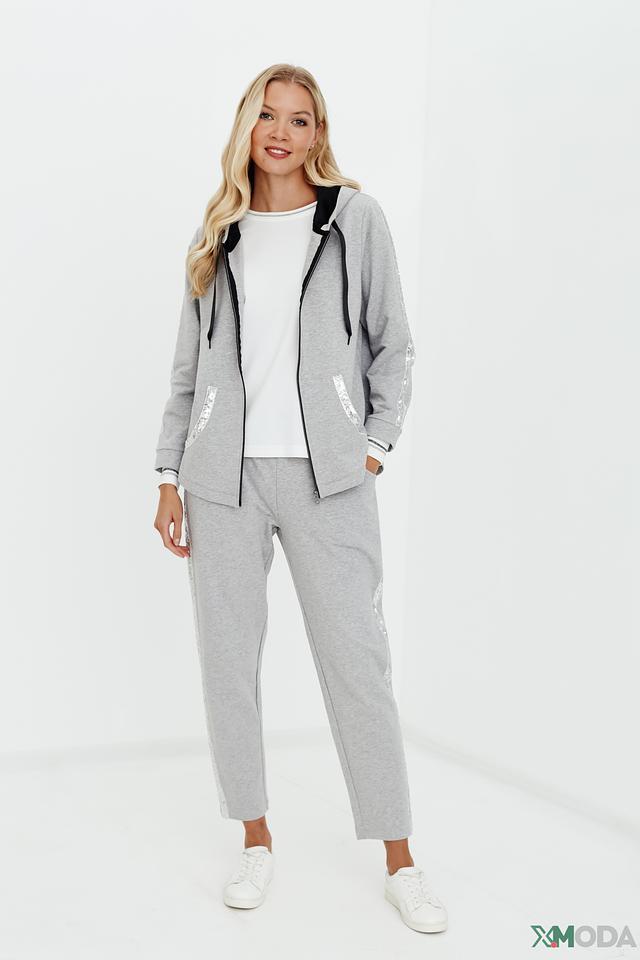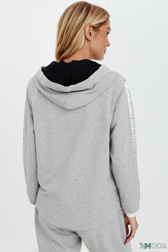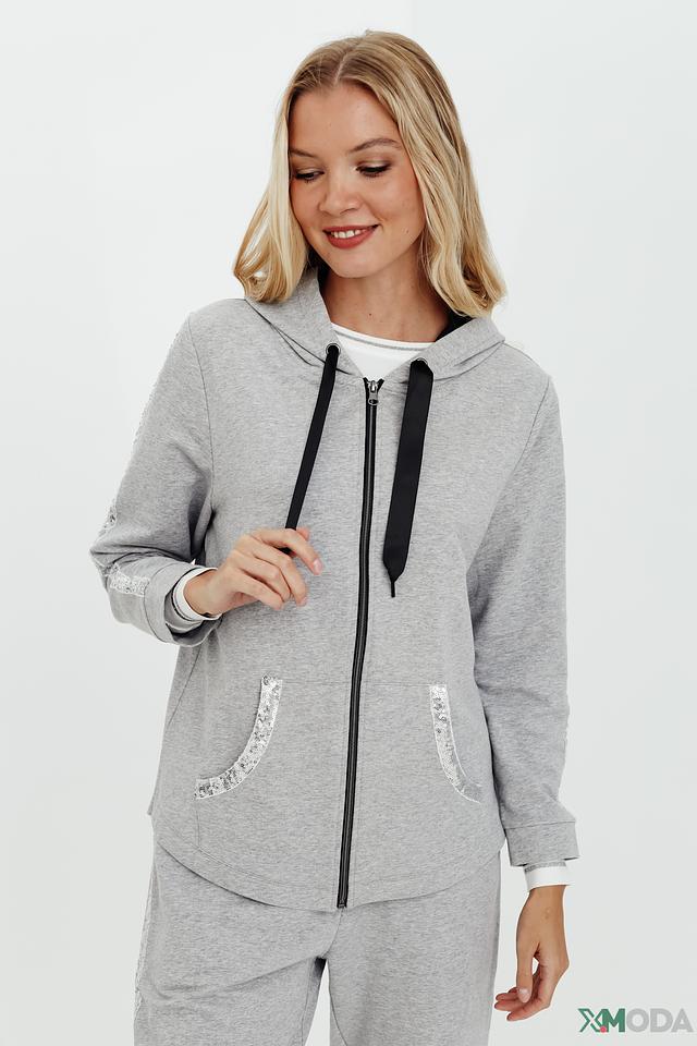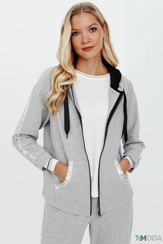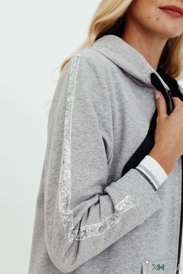 Серый жакет Pezzo с капюшоном и отделкой пайетками – стильное и комфортное решение для создания модных образов. Модель на молнии с удобными карманами и мягкой хлопковой основой. Состав: хлопок 95%, эластан 5%