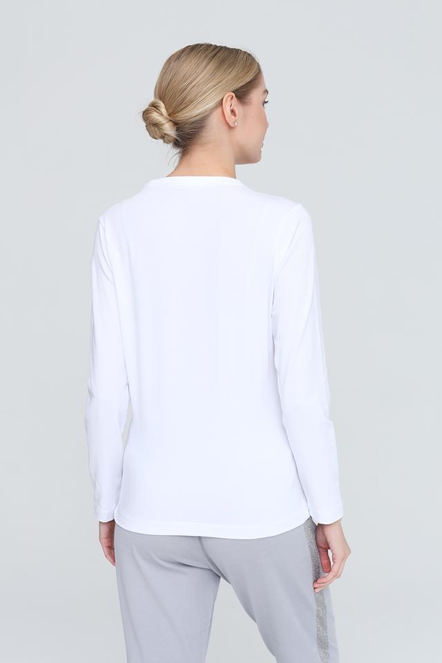 Лонгслив имеет классический крой с длинными рукавами и круглым вырезом горловины. Белый цвет делает его универсальным, позволяя легко сочетать с различными элементами одежды.