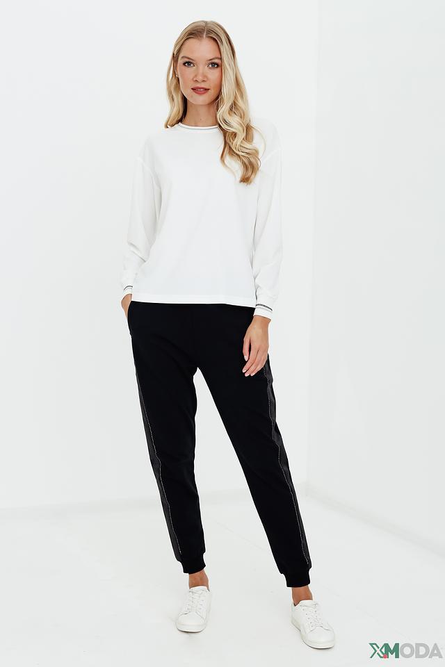 Брюки выполнены из высококачественного хлопка (95%) с добавлением эластана (5%), что обеспечивает приятные тактильные ощущения, хорошую посадку и лёгкость в уходе. Отличительной особенностью данной модели является декоративная полоса, проходящая вдоль штанины, выполненная из гладкой ткани с аккуратной строчкой.