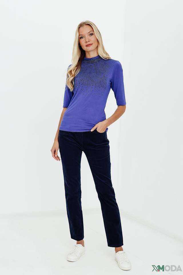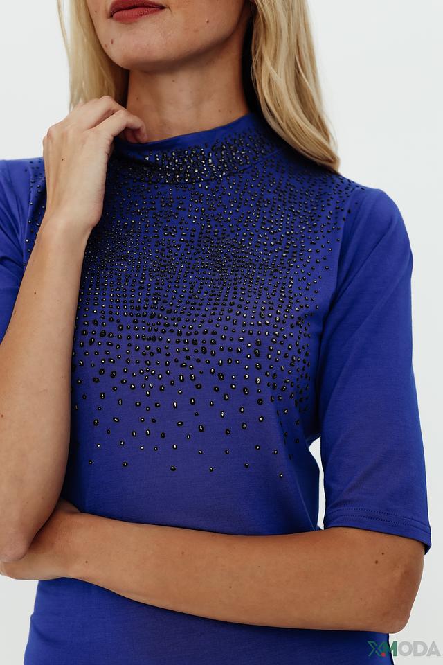 Пуловер имеет насыщенный синий цвет и аккуратный крой. Декоративные камни, расположенные на горловине, придают изделию изысканность и привлекают внимание. Рукава 3/4 делают этот пуловер универсальным для любого времени года.