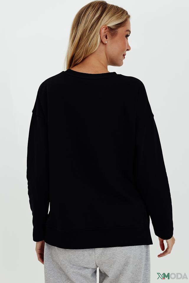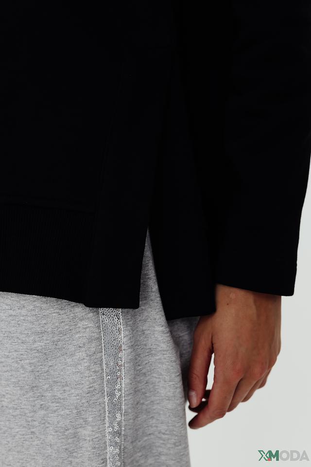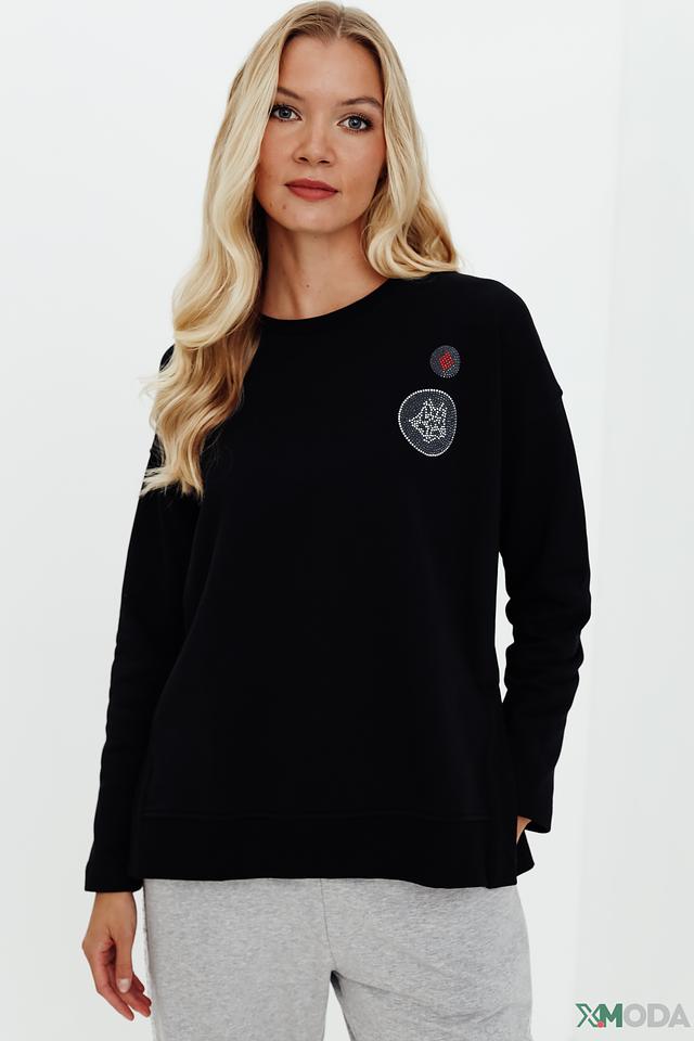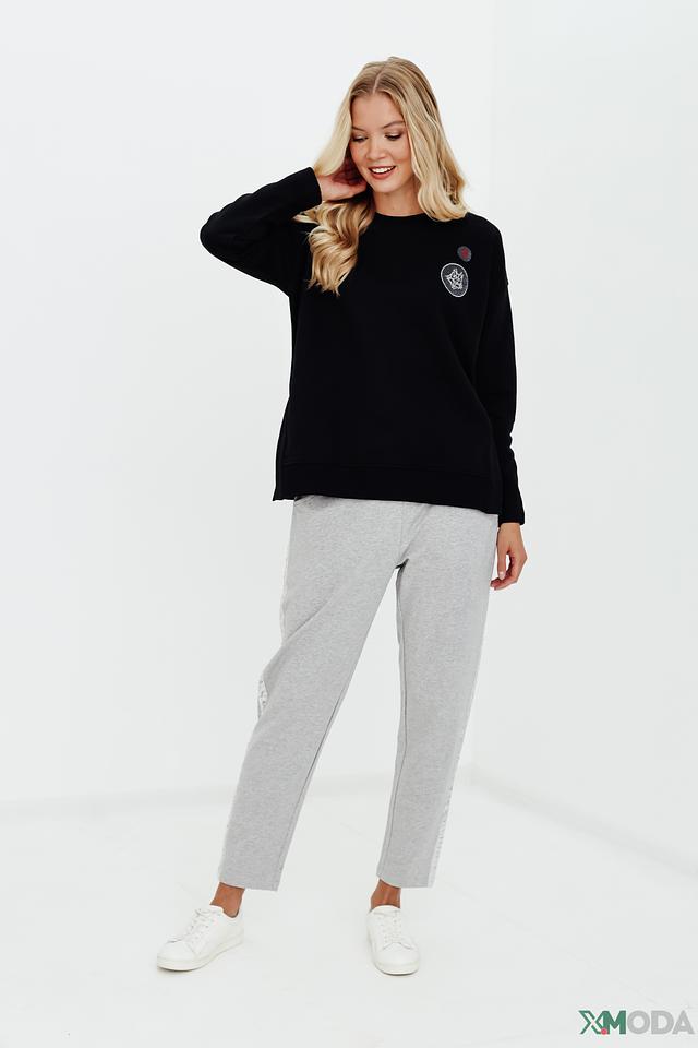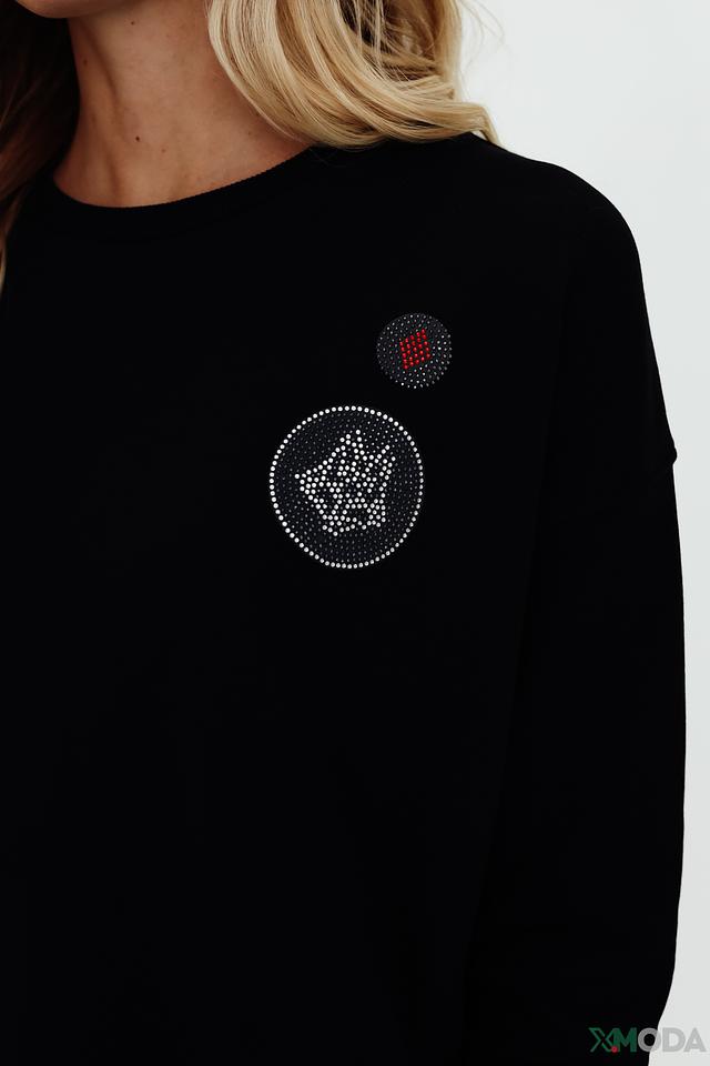 Особенностью модели является декоративная отделка в виде аппликации с изображением короны, украшенной стразами, и небольшой круглой нашивки. Эти детали придают пуловеру изысканность и индивидуальность.