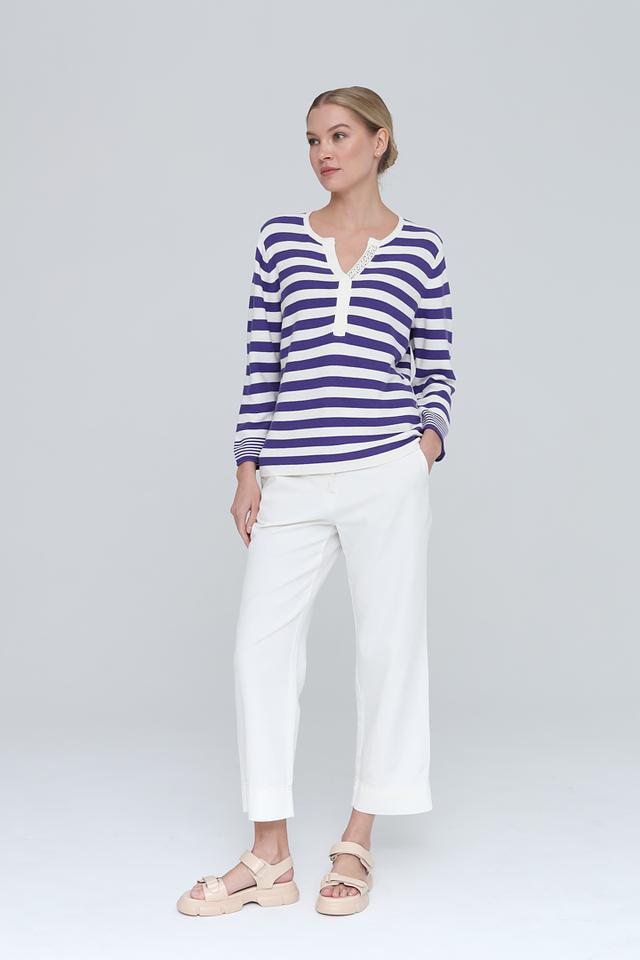 Женский джемпер Pezzo сине-белого цвета с полосками и декоративной V-образной горловиной. Модель выполнена из мягкого и приятного к телу сочетания хлопка и акрила. Состав: хлопок 60%, акрил 40%