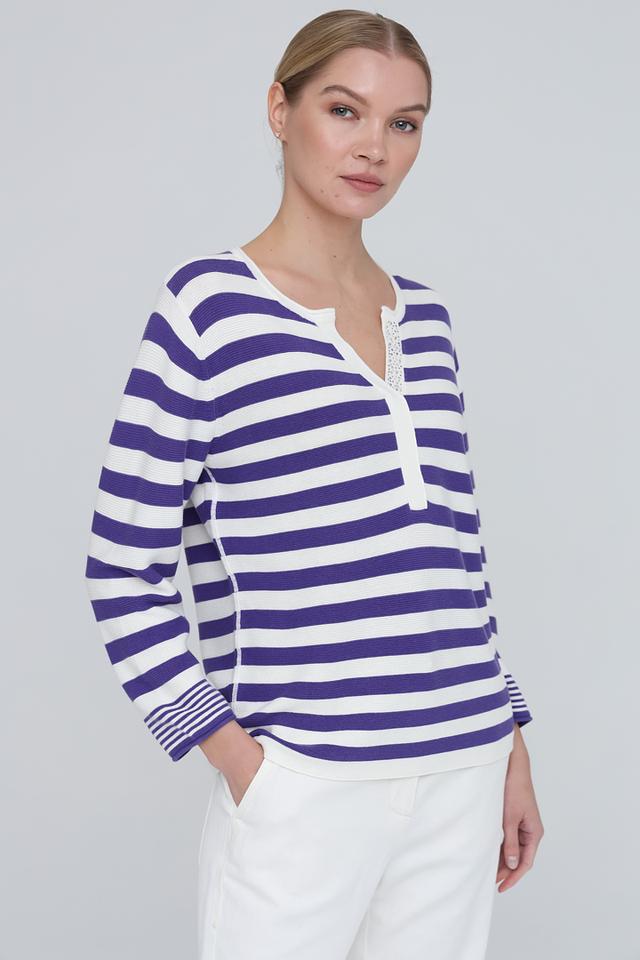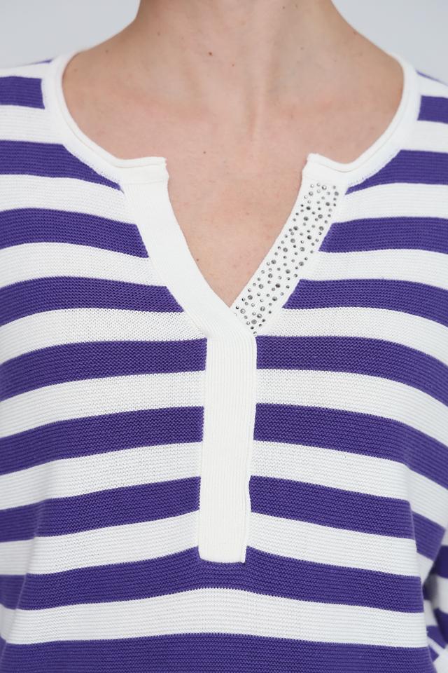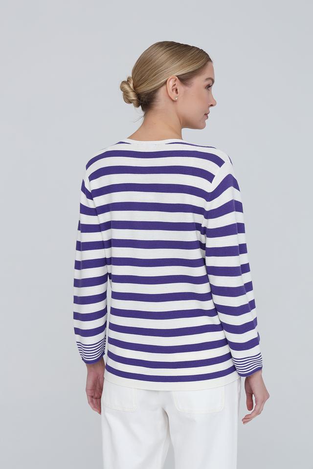 Этот стильный джемпер от Pezzo станет отличным дополнением к вашему гардеробу. Модель выполнена в классическую сине-белую полоску, что придает ей универсальность и легкость в сочетании с другими вещами.