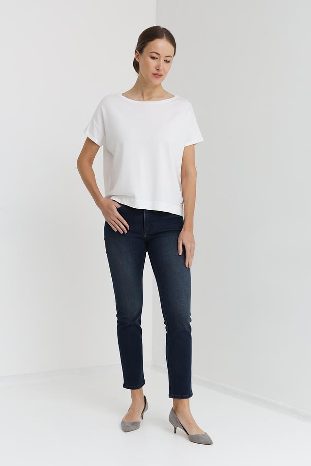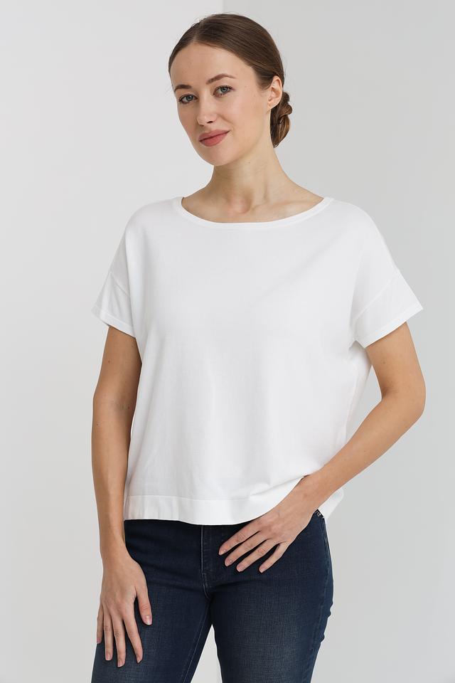 Модель имеет прямой крой, округлый вырез горловины и короткие рукава, что делает ее идеальным выбором для теплой погоды или для создания многослойных образов.