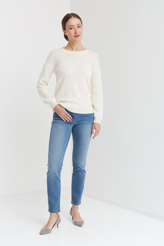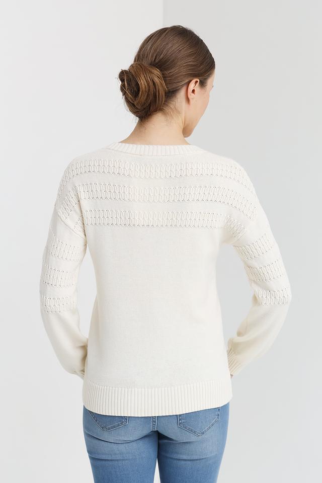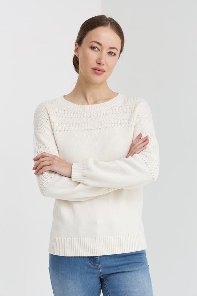 Молочный цвет изделия делает его универсальным и легко сочетаемым с различными элементами гардероба. Пуловер имеет классический крой с длинными рукавами и круглым вырезом горловины.