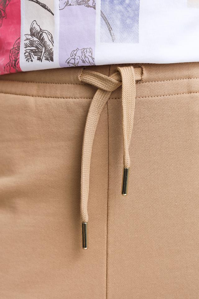 Брюки изготовлены из 100% хлопка, что обеспечивает комфорт и воздухопроницаемость. Эластичный пояс дополнен кулиской с металлическими наконечниками, позволяющей регулировать посадку по фигуре. Удобный крой и манжеты внизу брюк создают расслабленный и современный образ.
