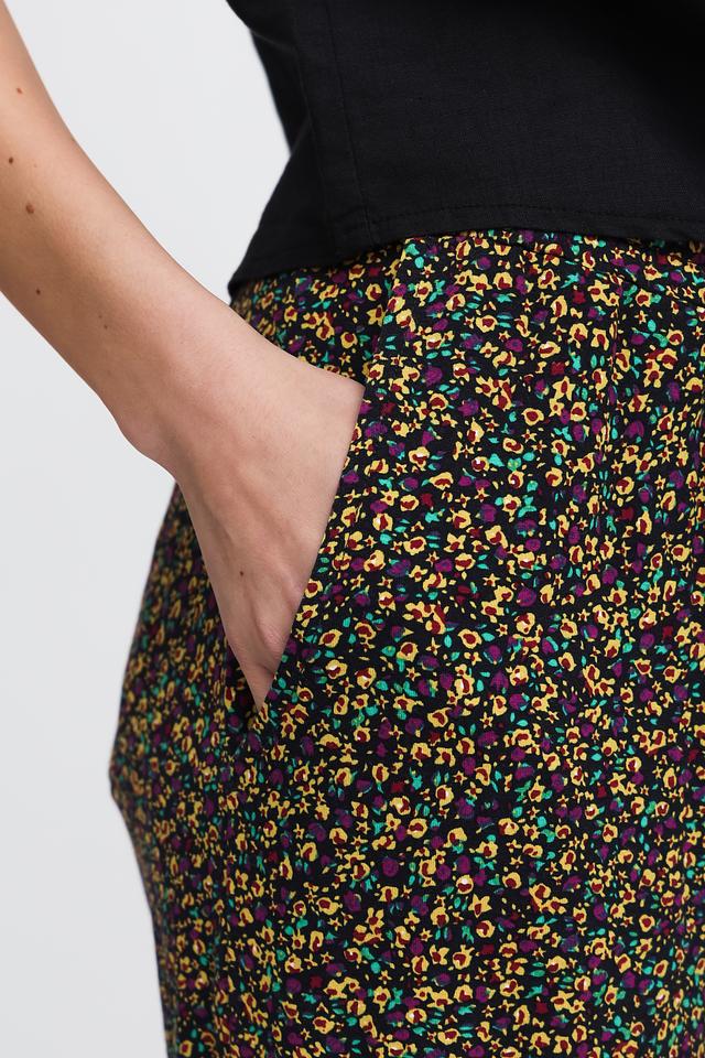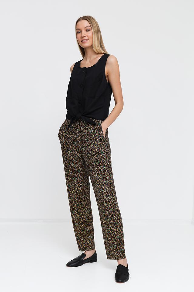 Брюки имеют классический крой с завышенной талией и прямыми штанинами. Пояс дополнен эластичной резинкой и завязками, что позволяет регулировать посадку по фигуре. На брюках расположен яркий цветочный принт, который добавляет образу женственности и оригинальности.