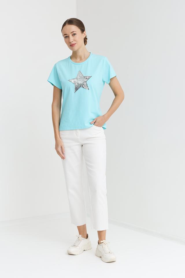 Основной цвет футболки – нежно-голубой, который прекрасно сочетается с различными оттенками. Главной особенностью модели является крупная звезда, выполненная из сверкающих пайеток. Звезда придает футболке праздничный и игривый вид.