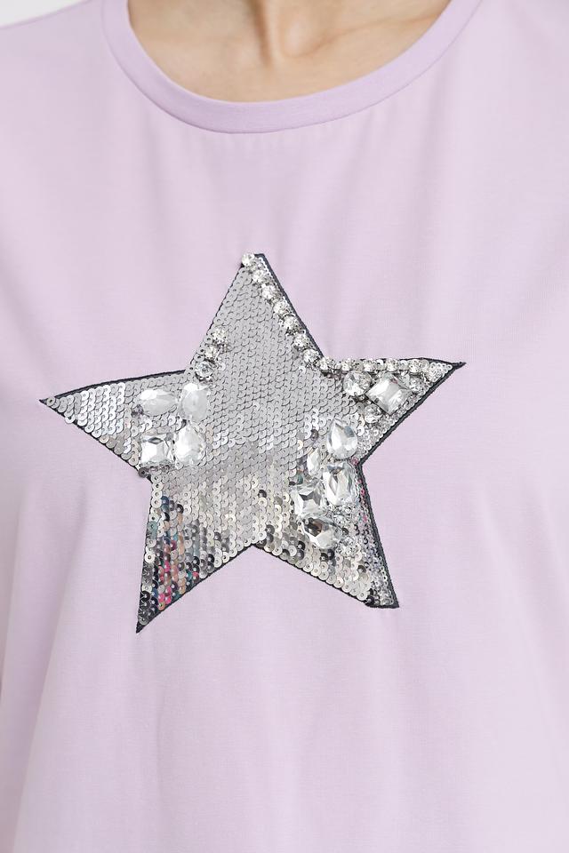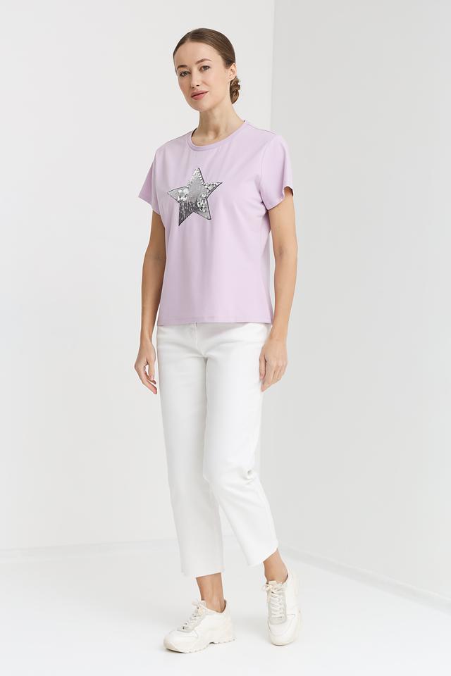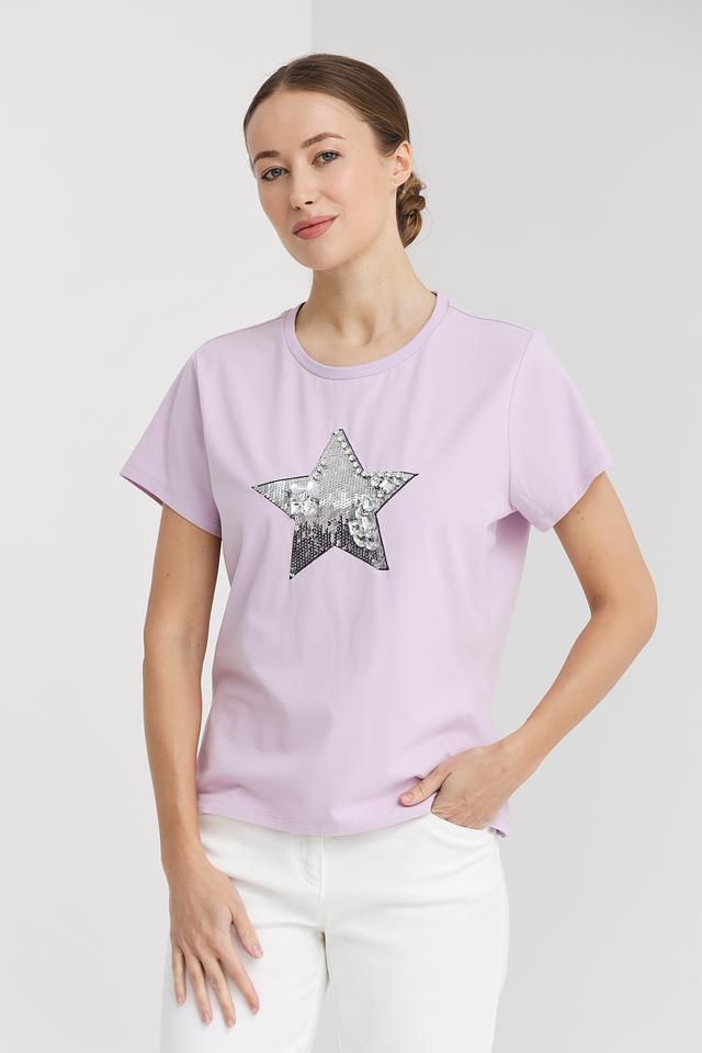 Основной цвет футболки – нежный лавандовый, который прекрасно сочетается с различными оттенками. Главной особенностью модели является яркая аппликация в виде звезды, выполненная из мерцающих серебристых пайеток. Эта деталь придает футболке праздничный и стильный вид.