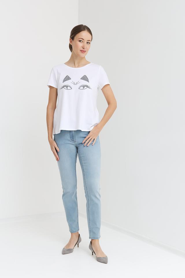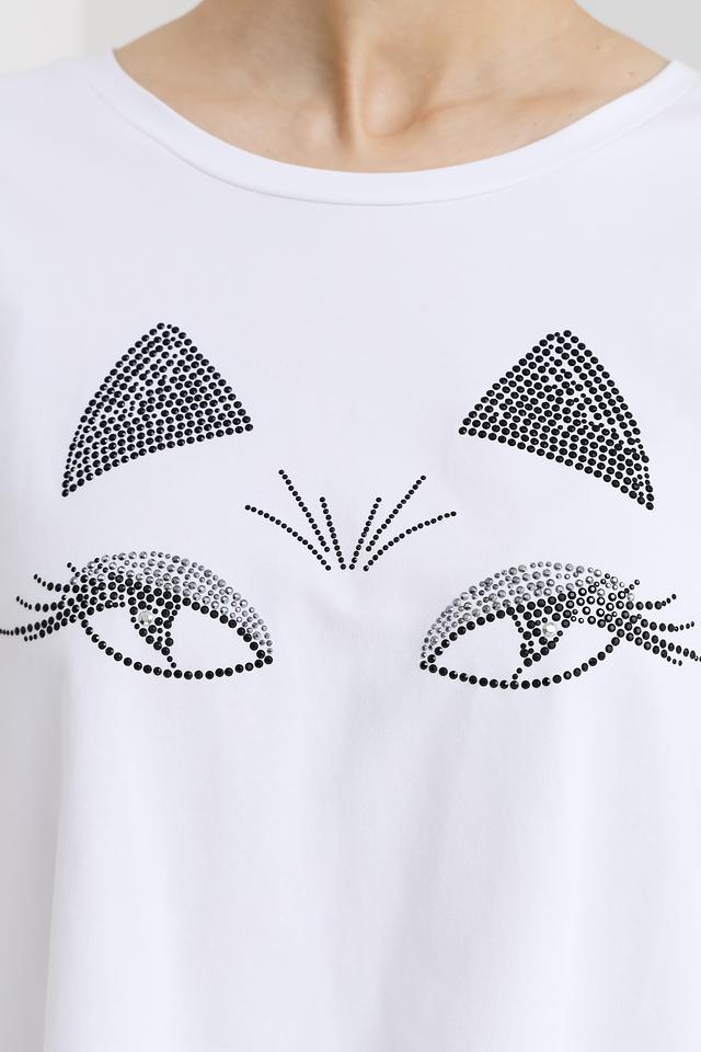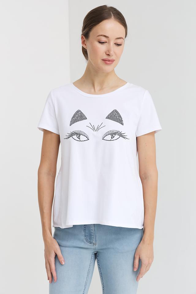Особенностью данной модели является оригинальный принт на лицевой стороне – стилизованное изображение кошачьих глаз, выполненное с использованием декоративных элементов. Футболка имеет классический крой с короткими рукавами и круглым вырезом горловины.