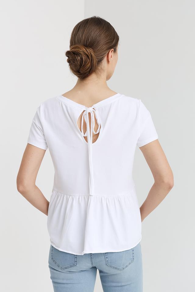 Спинка футболки украшена небольшим вырезом с завязками, что добавляет ей изысканности и женственности. Эта модель идеально подойдет для создания повседневных образов, сочетаясь с джинсами, шортами или юбками.
