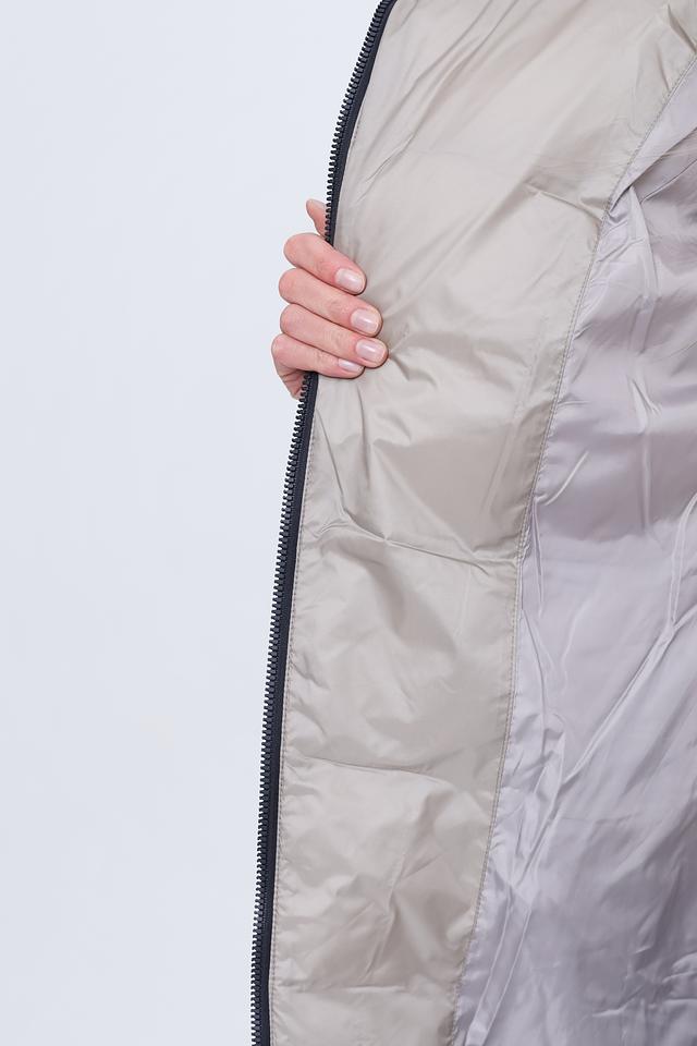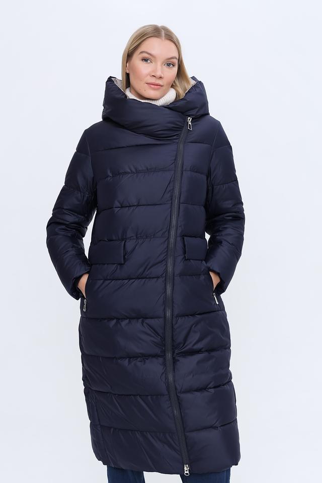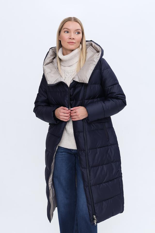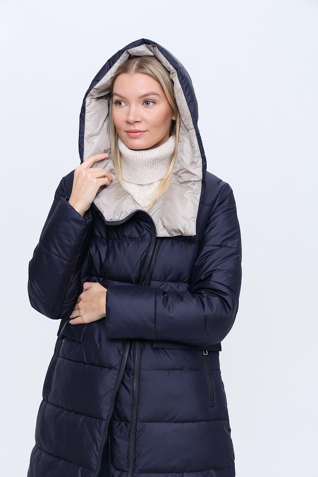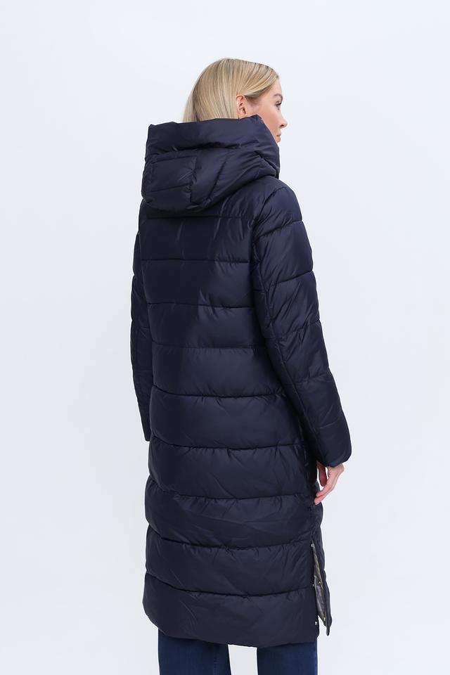 Модель имеет прямой крой и длину до середины икры, что обеспечивает свободу движений и защиту от холода. Капюшон добавляет функциональности, защищая от ветра и осадков. Пальто застегивается на молнию, что обеспечивает удобство и быстроту одевания.