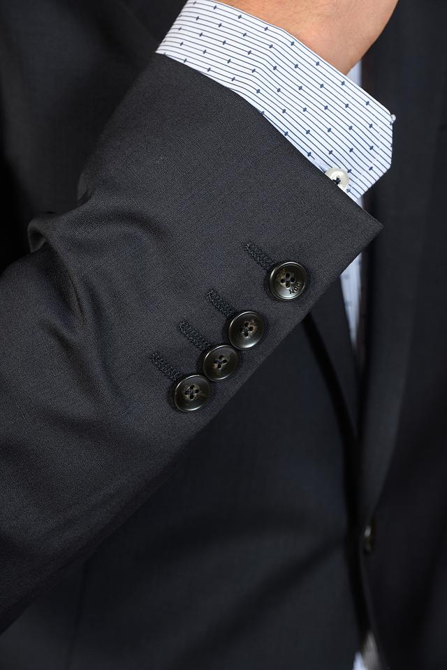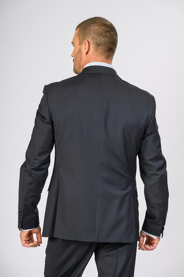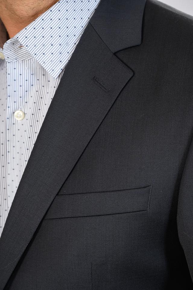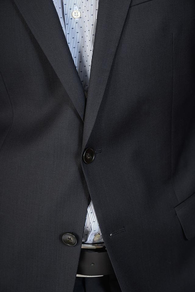 Пиджак имеет классический лацкан, однобортную застёжку на две пуговицы и функциональные карманы с клапанами. На рукавах расположены декоративные пуговицы. Ткань пиджака состоит из 98% шерсти и 2% эластана, что обеспечивает комфорт в носке, хорошую посадку по фигуре и устойчивость к сминанию.