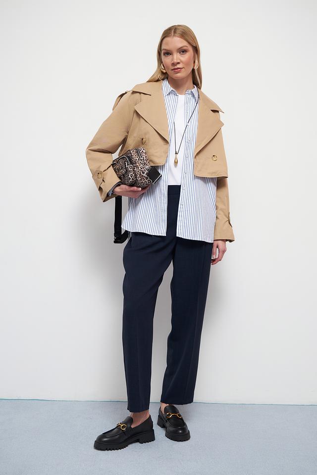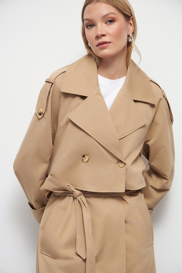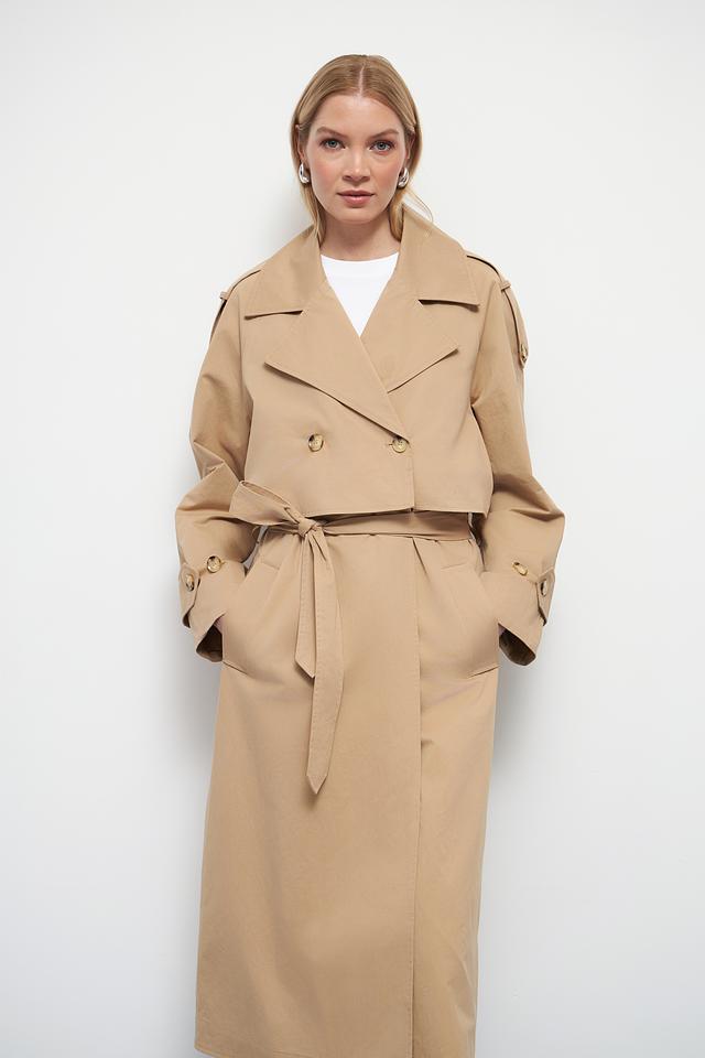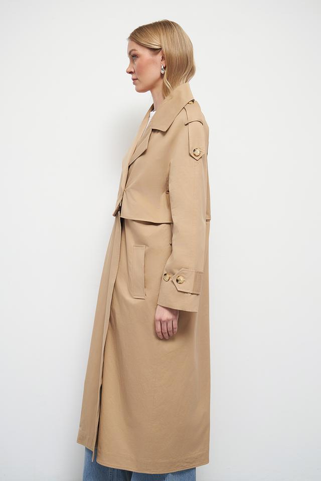 Классический тренчкот отличается прямым кроем, который подходит для любой фигуры. Двубортная застёжка с пуговицами добавляет образу строгости и изысканности. Широкий отложной воротник и погоны на плечах подчеркивают стиль и внимание к деталям.