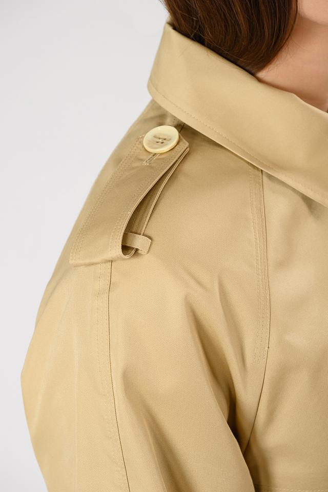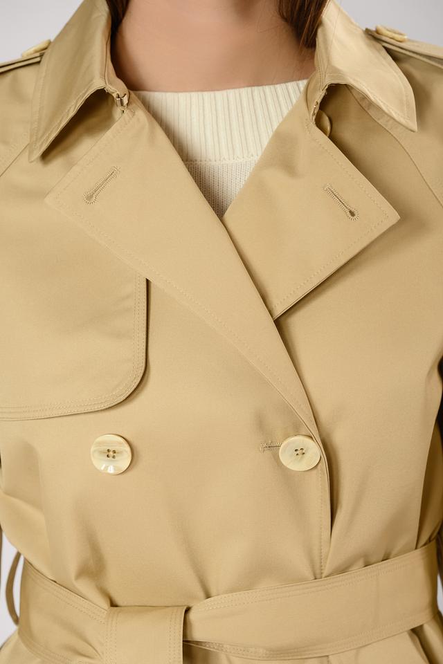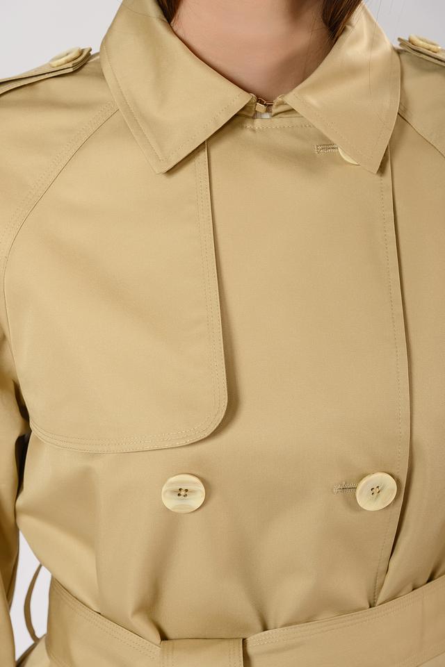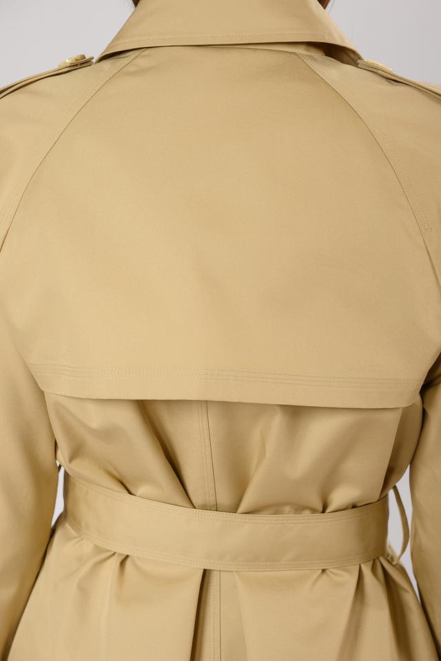Плащ имеет двубортную застёжку на пуговицы, что позволяет регулировать степень прилегания. Пояс подчеркивает талию и создает женственный силуэт. Погоны на плечах добавляют плащу строгости и элегантности.