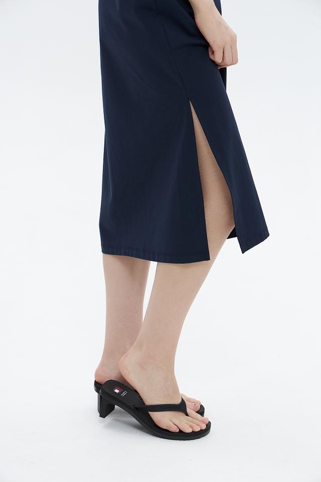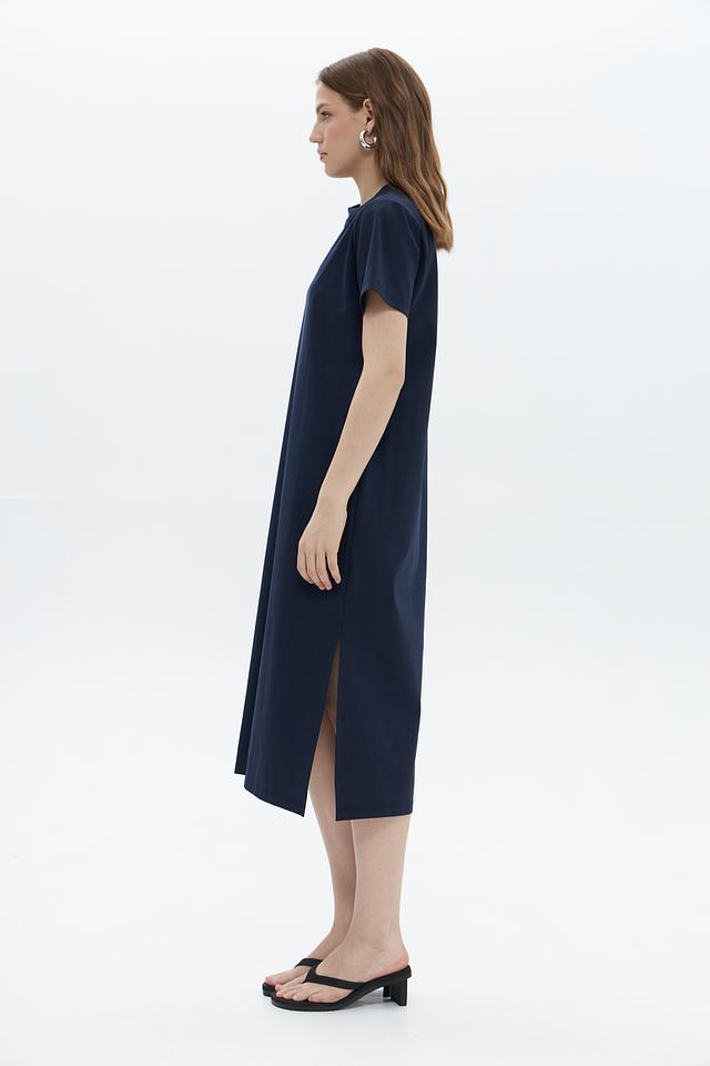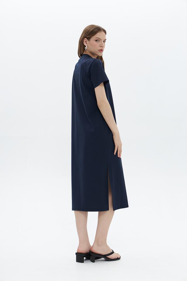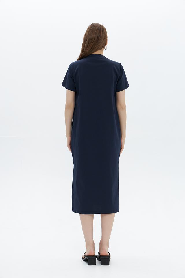 Платье имеет прямой силуэт, который подчеркивает фигуру, не сковывая движений. Короткие рукава и круглый вырез горловины обеспечивают комфорт в жаркую погоду. Боковой разрез добавляет образу лёгкости и динамики.