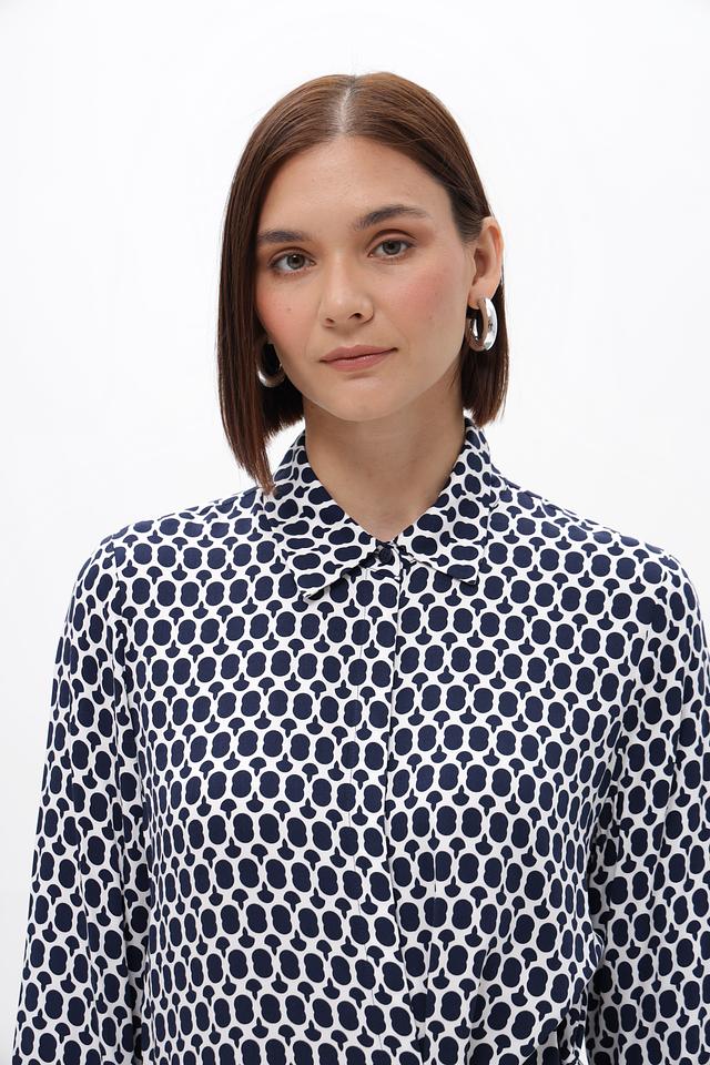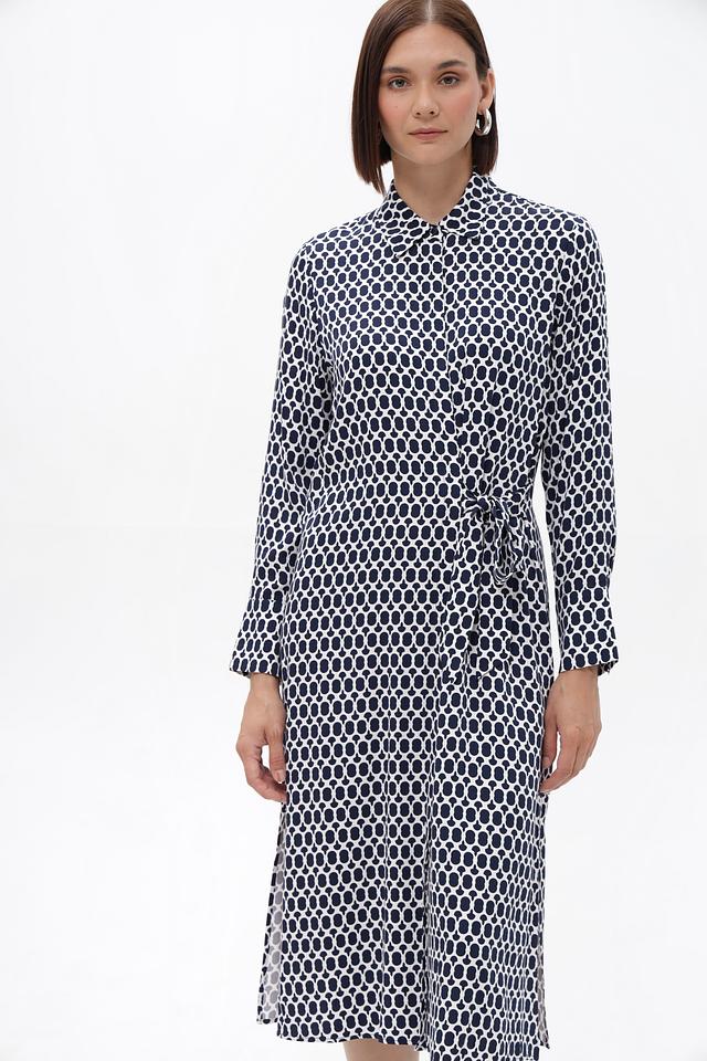 Платье Olsen синего цвета с геометрическим принтом – стильное и комфортное решение для повседневного образа. Модель выполнена из 100% вискозы, имеет воротник-стойку и завязывающийся пояс. Состав: вискоза 100%