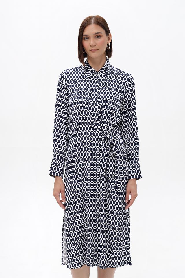Платье имеет прямой крой, воротник-стойку и длинные рукава. Завязывающийся пояс позволяет подчеркнуть талию и создать более женственный силуэт. Модель выполнена из 100% вискозы, что обеспечивает комфорт и приятные ощущения при носке.