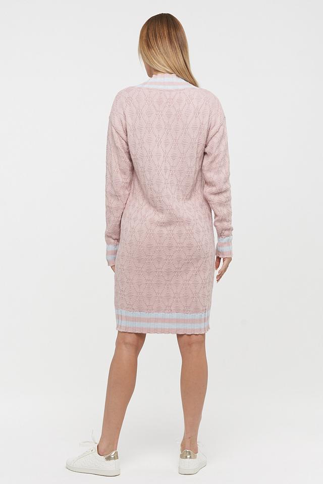 Отличительной особенностью модели является вязаная текстура с ромбовидным узором и контрастная полоса на вырезе горловины, манжетах рукавов и нижней части платья. Цветовая гамма представлена нежным розовым оттенком с голубыми и белыми акцентами.