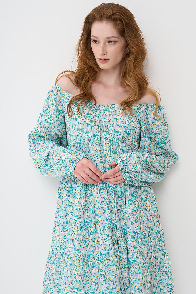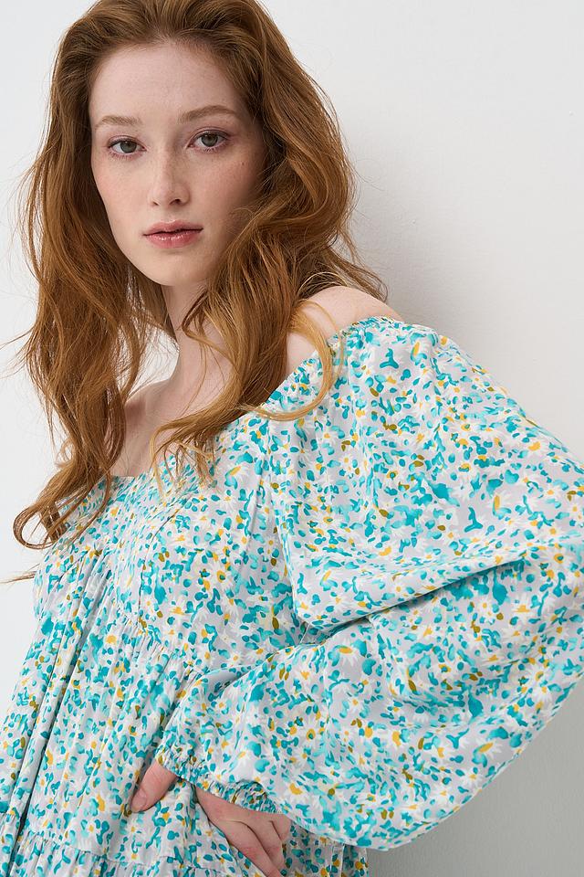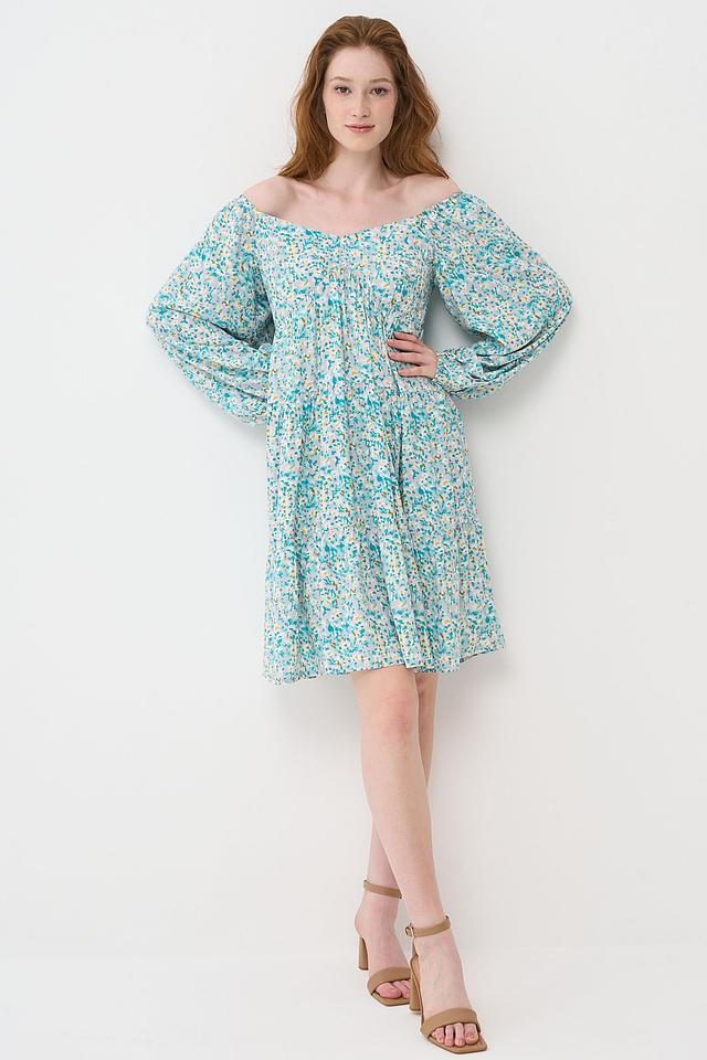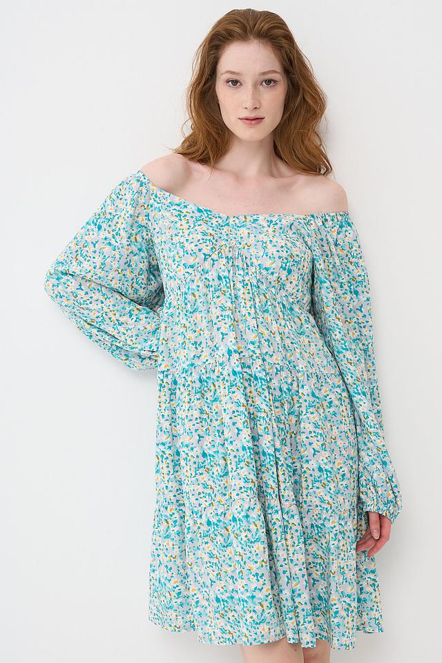 Короткое платье BE YOU голубого цвета с нежным цветочным принтом. Модель выполнена в свободном крое с рукавами-фонариками и открытыми плечами, что придает образу легкость и женственность. Состав: