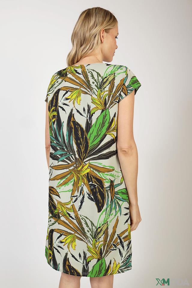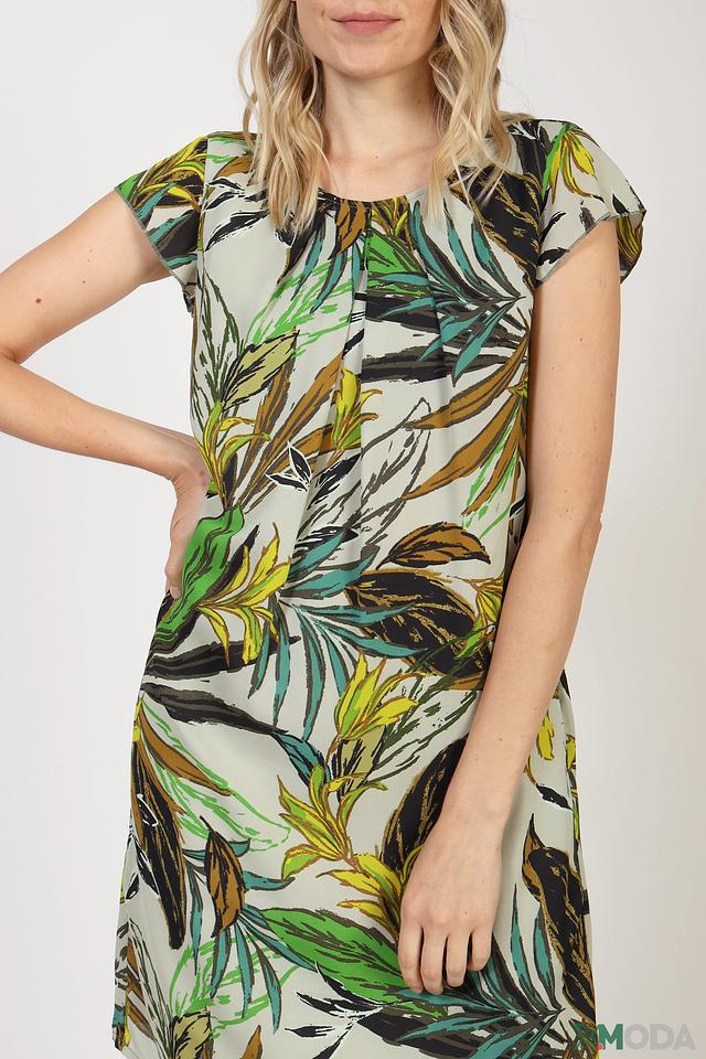 Платье имеет прямой силуэт и длину до колена. Короткие рукава и округлый вырез горловины добавляют образу женственности. Основной цвет платья – светло-зеленый, но оно украшено ярким и красочным принтом в виде тропических листьев, выполненным в зеленых, желтых и коричневых тонах.