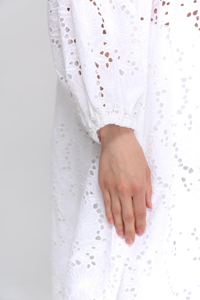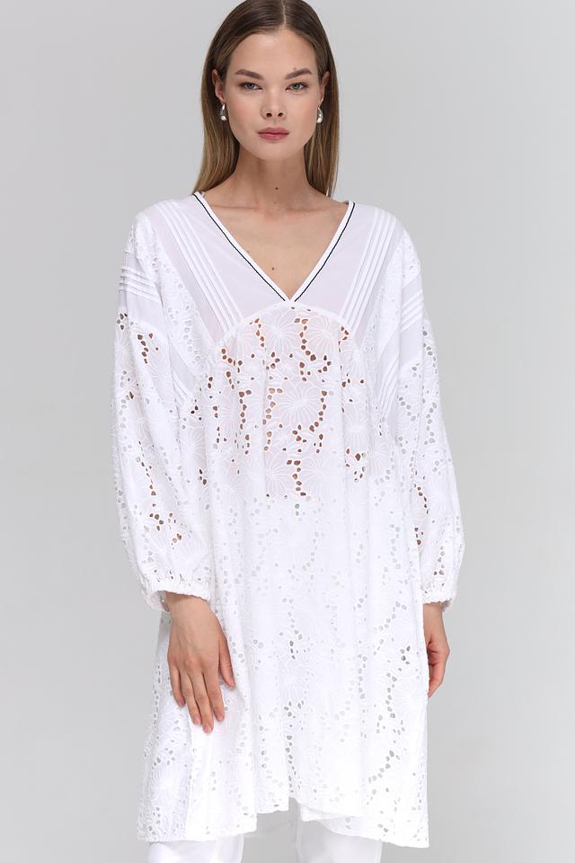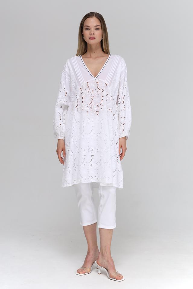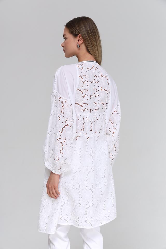 Платье имеет свободный крой, который не сковывает движений и подходит для разных типов фигур. V-образный вырез горловины и рукава-фонарики придают образу женственность и лёгкость. Особый акцент сделан на ажурной вышивке, которая украшает всю поверхность платья, добавляя ему изысканности.
