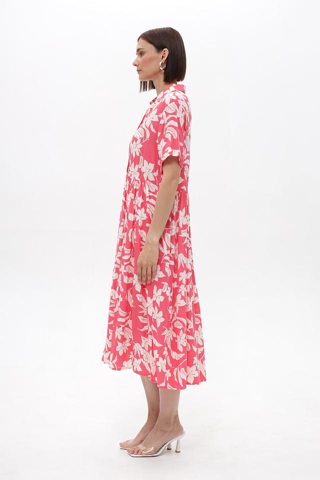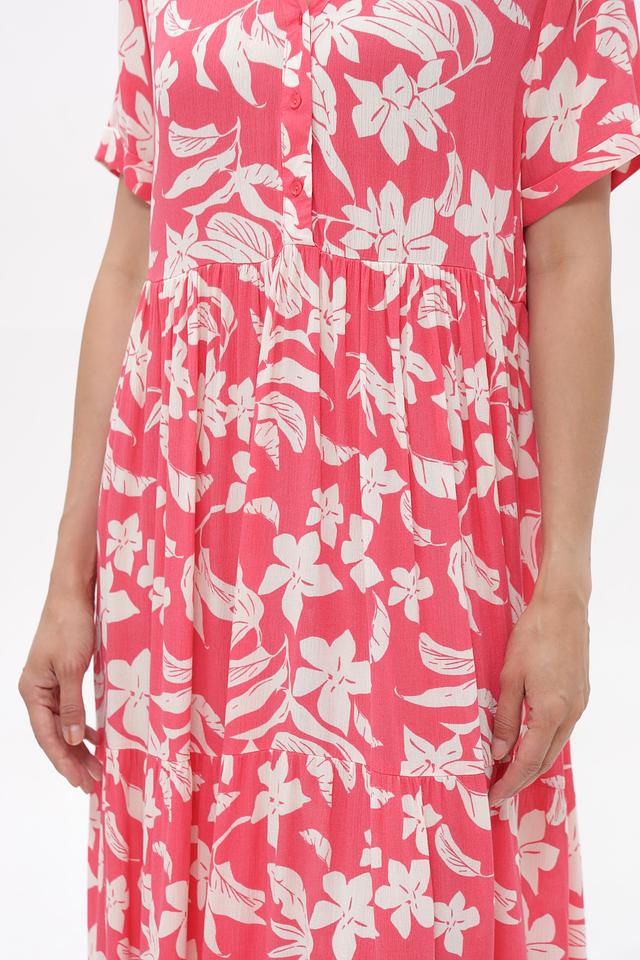 Это платье от бренда Broadway выполнено из 100% вискозы, что обеспечивает легкость и приятные ощущения на коже. Преобладающий цвет – коралловый, украшенный нежным цветочным принтом белого цвета.