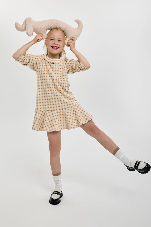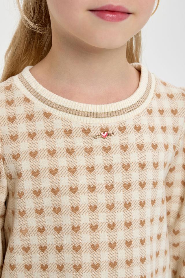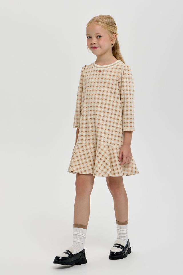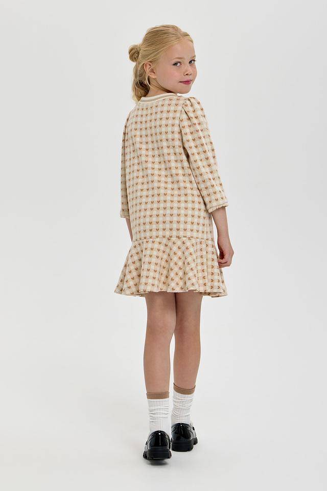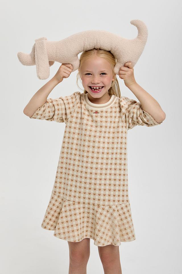 Платье выполнено в приятной кремовой цветовой гамме и украшено милым принтом в клетку, в котором спрятаны маленькие сердечки. Фасон платья – свободный, с небольшим расклешением к низу, что обеспечивает свободу движений и комфорт во время активных игр.