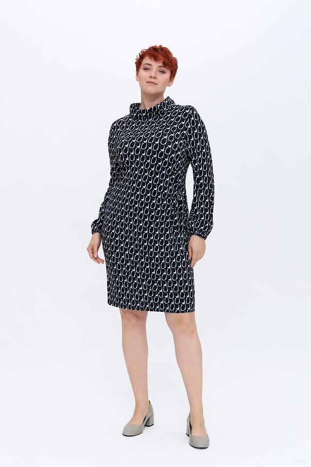 Модель имеет прямой силуэт, длину до колена и длинные рукава с небольшими сборками у манжет. Высокий воротник-стойка добавляет образу изысканности. Платье выполнено из качественной вискозы с добавлением эластана, что обеспечивает приятные тактильные ощущения и хорошую посадку по фигуре.