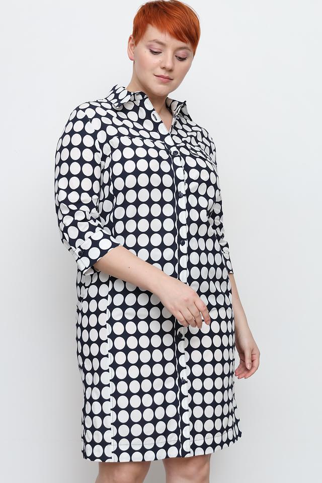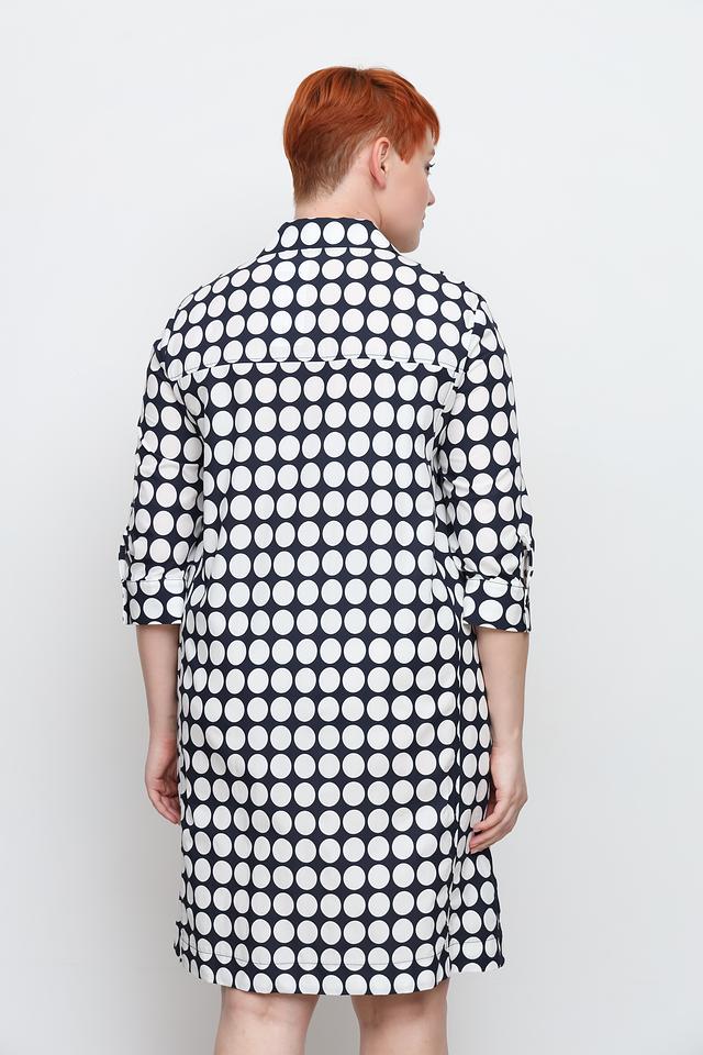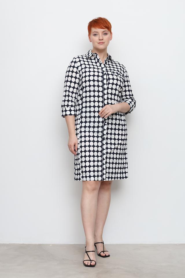 Платье имеет классический рубашечный крой с воротником и застёжкой на пуговицы по всей длине. Особенностью модели является яркий принт в виде крупного белого горошка на чёрном фоне, который придаёт образу игривость и женственность.
